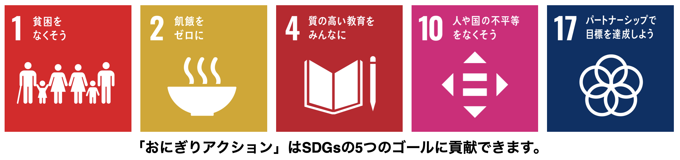 おにぎりにまつわる写真に「#OnigiriAction」を付けてSNSに投稿すると、協賛企業が寄付しTFTを通じて世界の子どもたちに給食5食が届きます。
