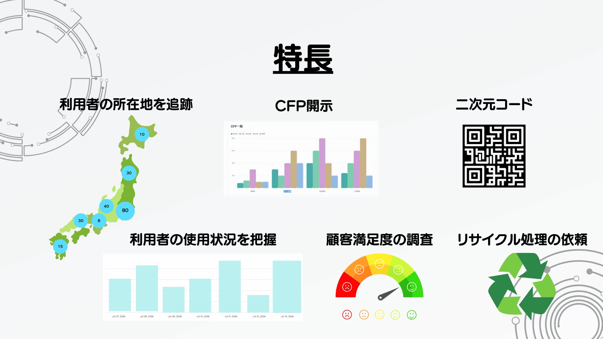 ダイナミック二次元コードや情報共有プラットフォームを通じて、取引先・消費者の所在地や利用状況の把握、カーボンフットプリントの追跡、顧客満足度の調査、リサイクル処理の促進を実現します。