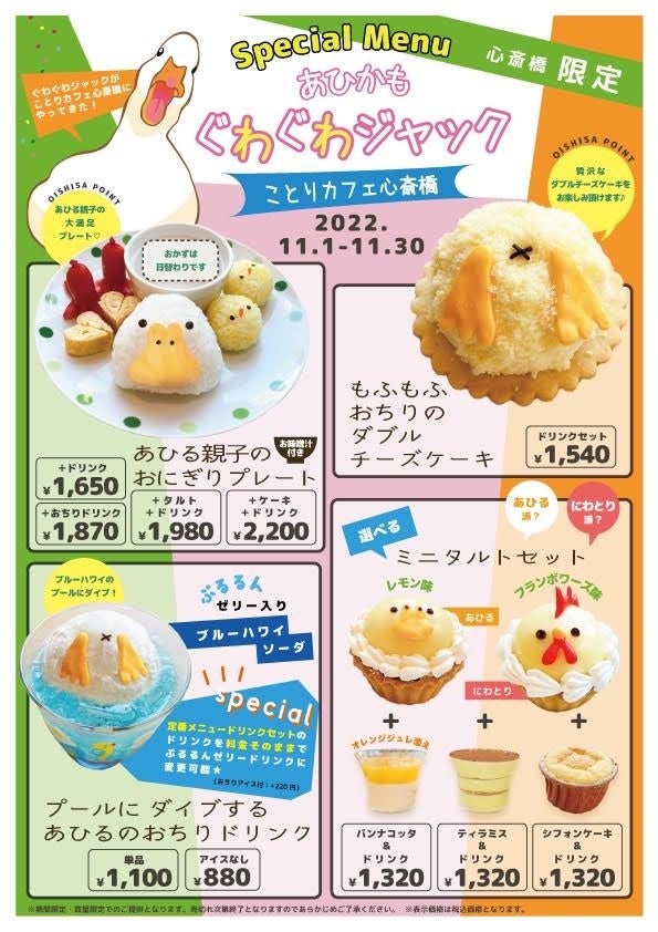 ★ことりカフェ心斎橋 新作メニュー★ あひるさんのおちりをモチーフにした「プールにダイブするあひるのおちりドリンク」などを2022/11/1に販売開始。