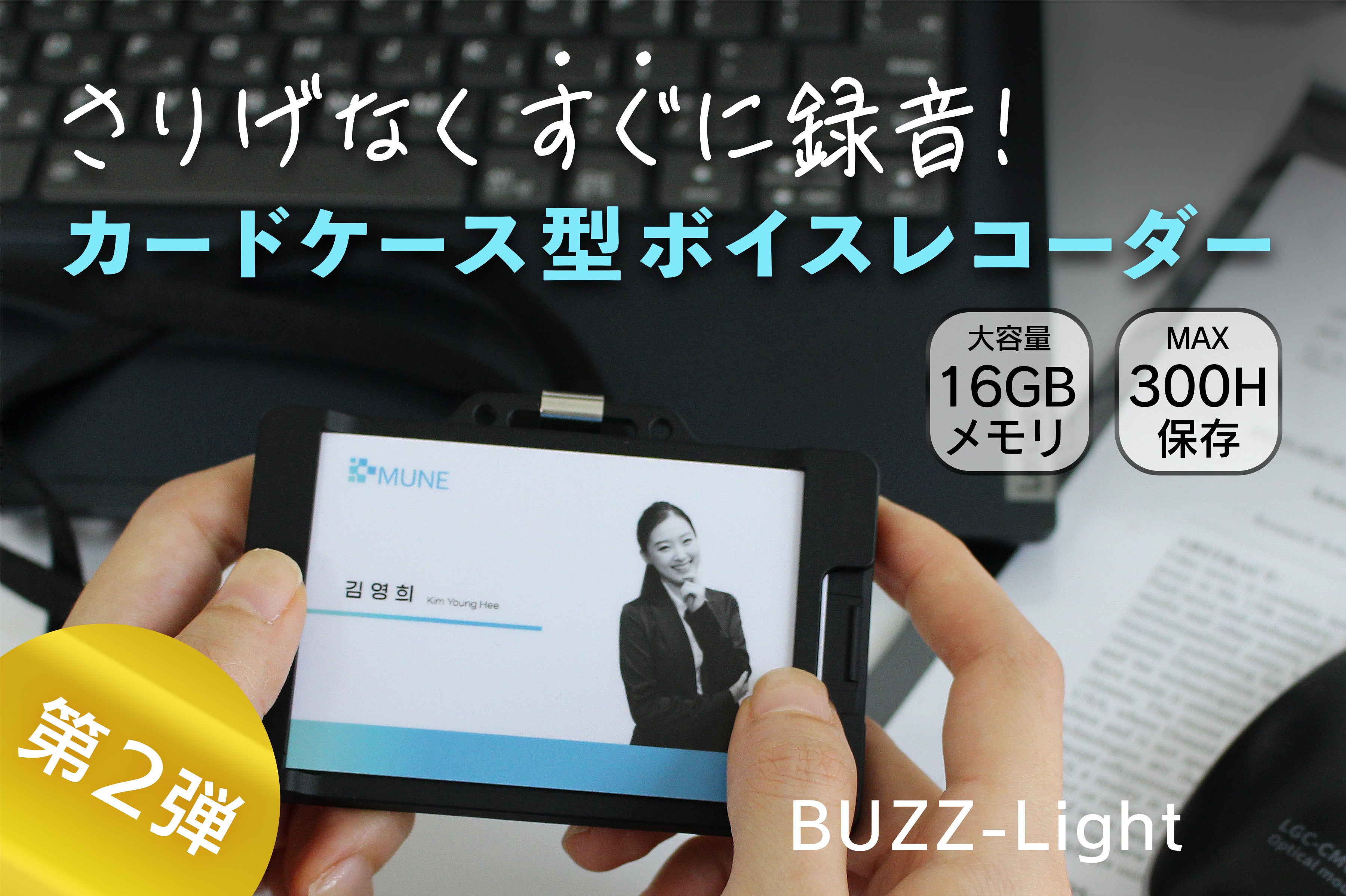 社員証やICカードを入れることができ、長時間録音可能な次世代カードケース型ボイスレコーダー「Buzz-Light (バズライト)」。今年6月にクラウドファンディングサービスのGREENFUNDING(グリーンファンディング)にて好評を集めた同商品の第2弾、新色&大容量型の支援を前回同様GREENFUNDINGにて募集します。