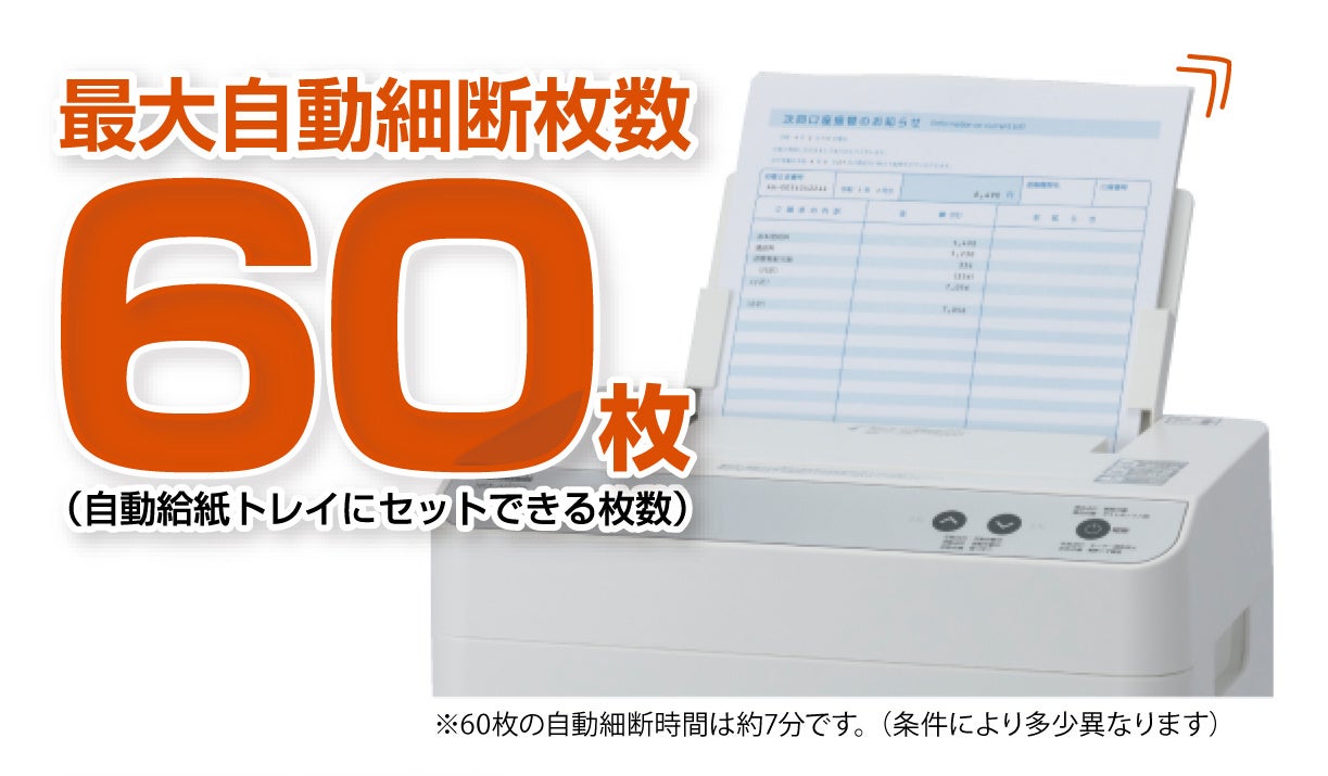 [最大自動細断枚数] | 60枚(A4上質紙:64g/㎡)※自動給紙トレイにセットできる枚数 ※郵便はがきなどの厚紙は自動細断できません。 |