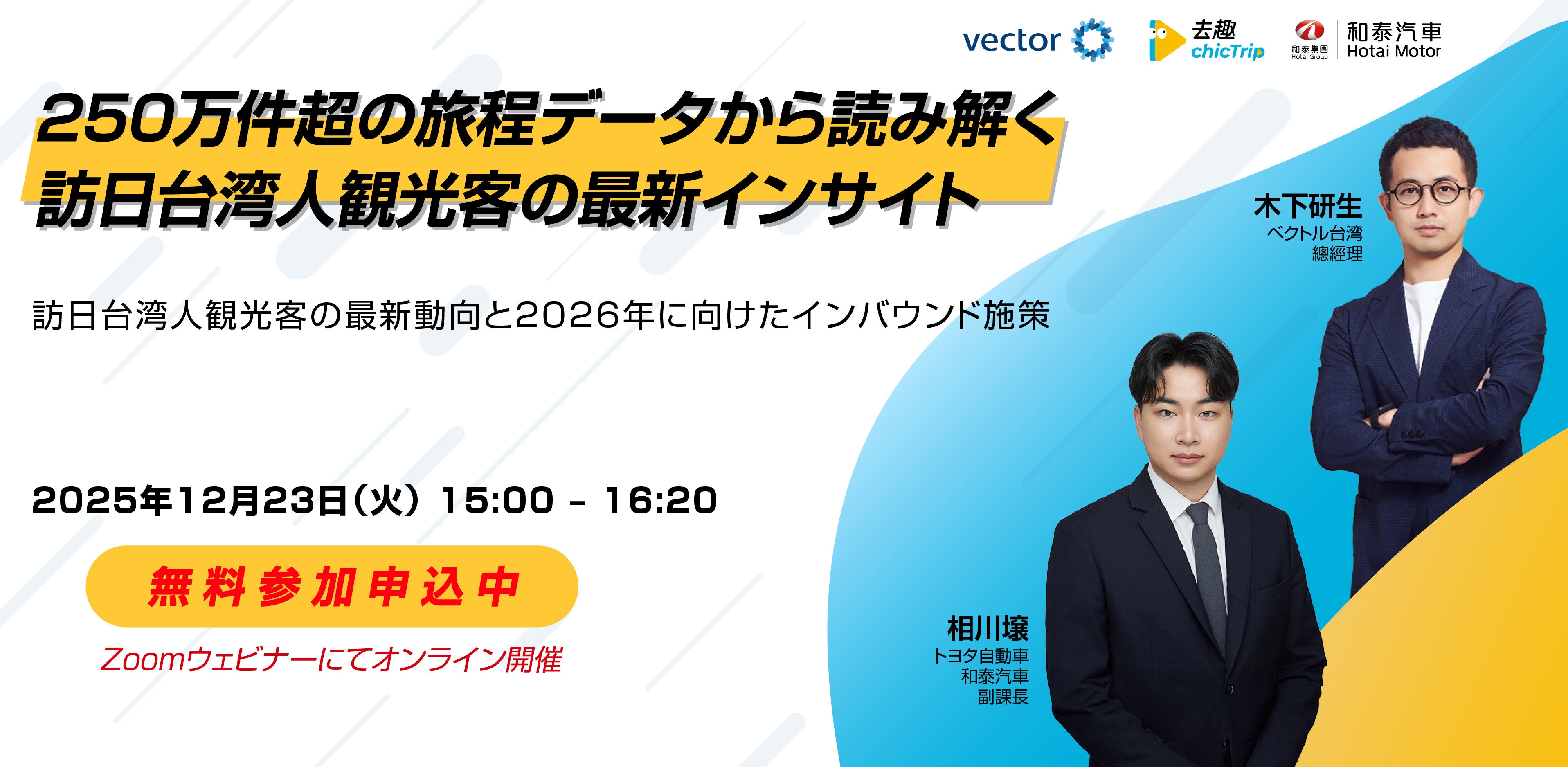 株式会社ベクトル(本社:東京都港区、代表取締役会長兼社長:西江 肇司、東証プライム:6058、以下ベクトル)の台湾法人であるVector Group International Limited(Taiwan)(所在地:台北市、総経理 木下 研生、以下ベクトル台湾)は、トヨタ・レクサス・日野の台湾総代理店である和泰汽車が提供する台湾最大の旅程作成アプリ 去趣(chicTrip) と共同で、2025年12月23日(火)15:00~16:20にオンラインセミナーを開催いたします。本セミナーでは、2025年の訪日台湾人観光客の動向をデータと共に振り返りつつ、訪日関連トレンドを読み解きます。さらに、台湾市場に効果的な台湾インバウンドプロモーションの最新手法を、具体例を交えながら分かり易くご紹介します。