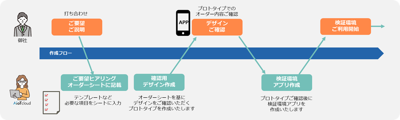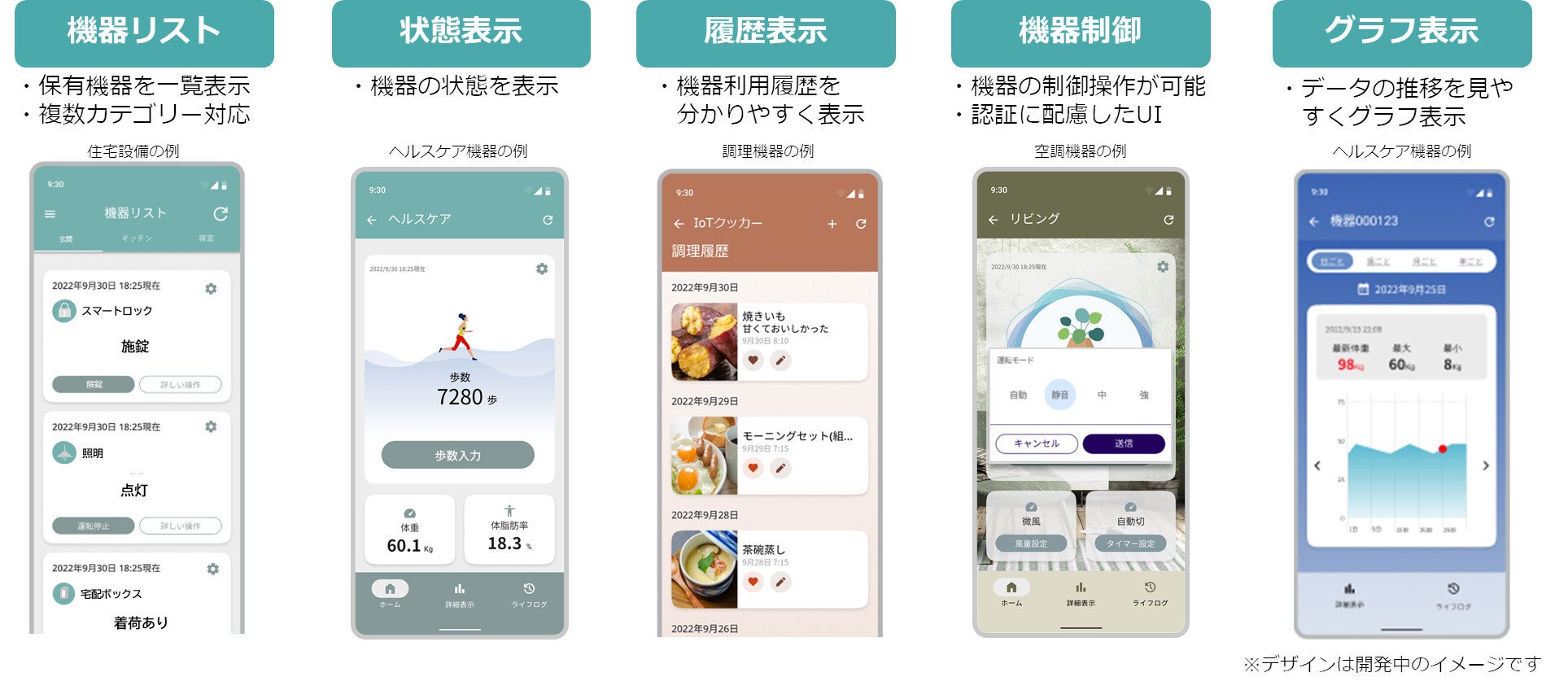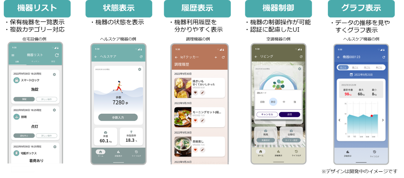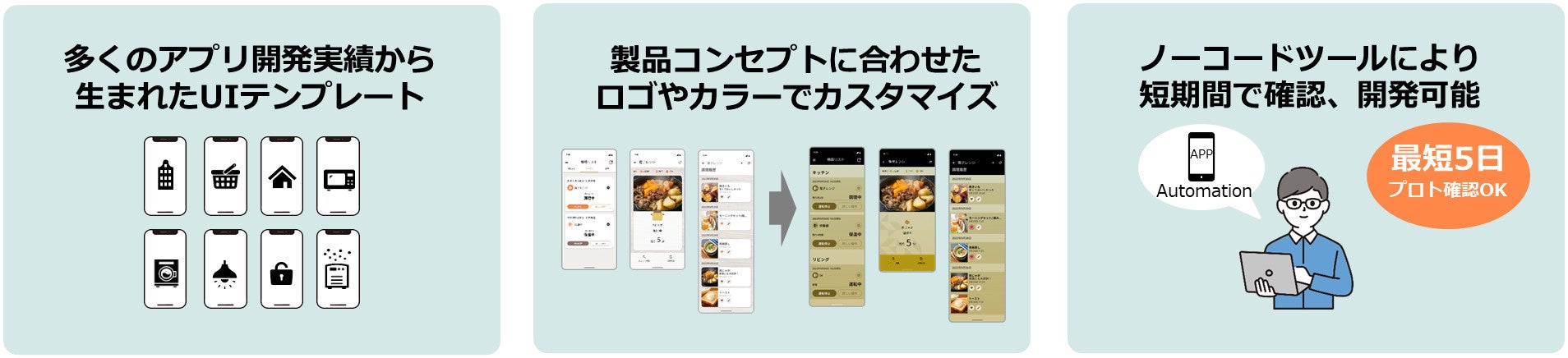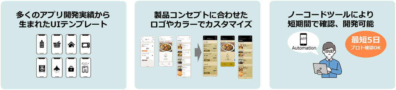 遠隔操作・状態確認や運転完了通知等で、製品の付加価値を高めるアプリも、豊富な開発ノウハウを凝縮したノーコードツールにより、カンタンに作成可能。製品カテゴリー、実現したいIoT機能などのご要望に基づいて、UIテンプレートを選んでいくだけで、最短5日ですばやくアプリのイメージを確認いただけます。