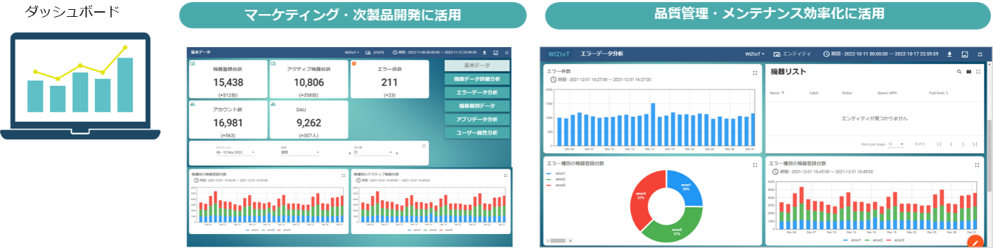 IoT製品を開発、ローンチしたものの、どのように製品データを分析、活用したらいいかわからないという声もよくお聞きします。当サービスでは、IoT製品からクラウドに上がってくるデータをわかりやすく数値やグラフで可視化する運用ツールとしてダッシュボードをご提供し、製品データの分析をご支援します。
