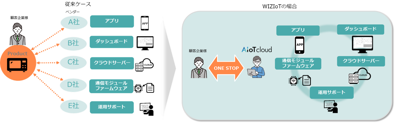 当社『WIZIoT(ウィジオ)』サービスでは、製品のIoT化に必要となる、通信モジュール(※1)用ファームウェア、クラウドサーバー、アプリ、ダッシュボードとサポートをまとめてご提供。ワンストップサービスにより、事前検討、要件定義、複数のベンダーとのコミュニケーションなどを効率化します。