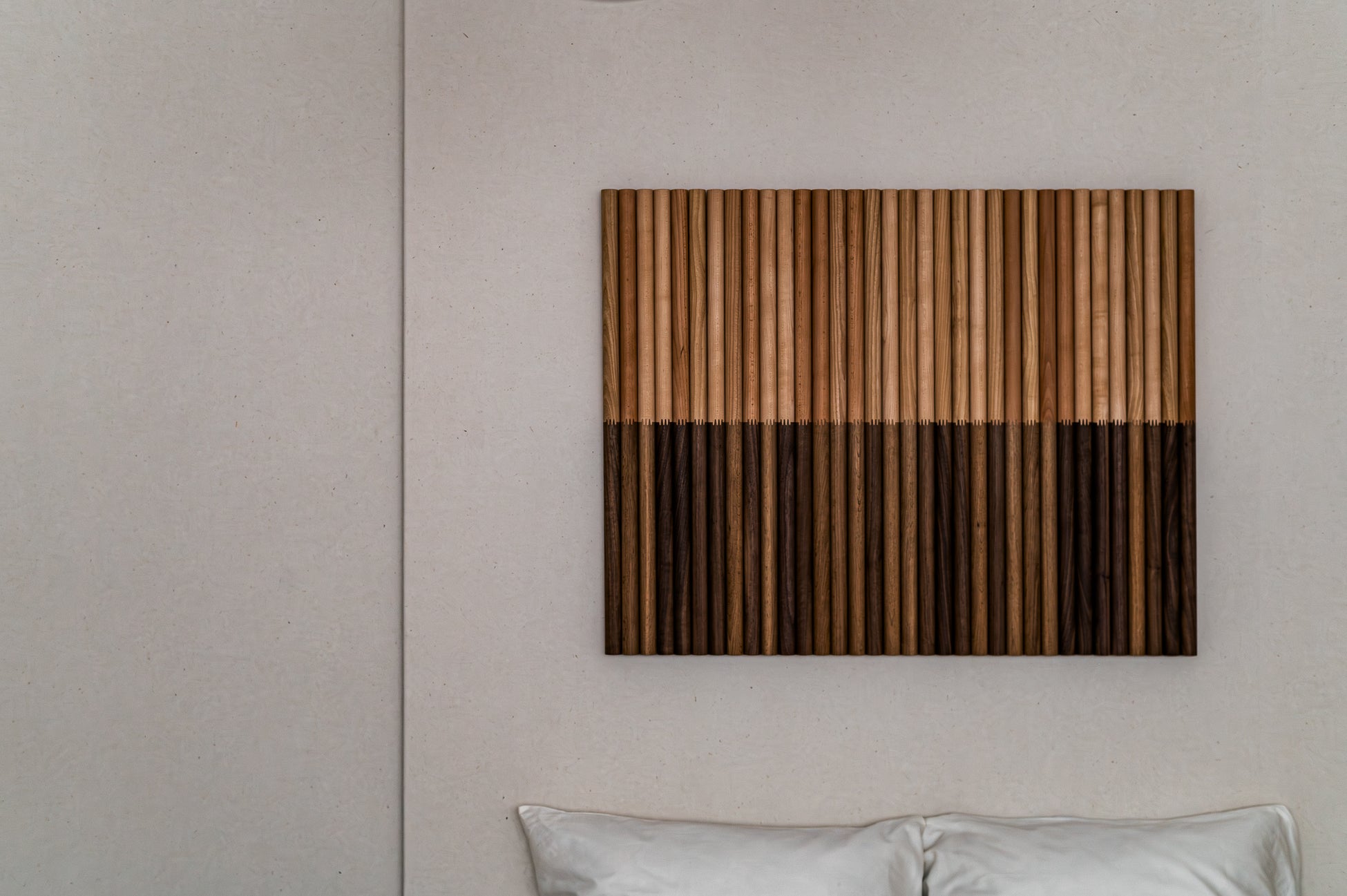 端材のアート壁:家具の端材を活用したフィンガージョイントの木部加工が美しいレリーフ。