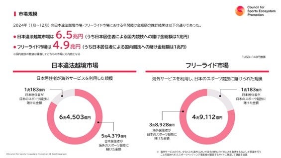 本調査の結果、上記1.の通り、日本違法越境市場の規模は年間賭け金総額約6.5兆円、フリーライド市場の規模は年間賭け金総額約4.9兆円と推計されることが確認されました。また、上記2.の通り、海外スポーツベッティングサイトの中には、著作権、肖像権・パブリシティ権等の権利を侵害する可能性のある態様でサービスを提供している例が散見されました。
