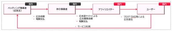 アフィリエイターは、海外スポーツベッティング事業者又は仲介事業者から、紹介したユーザーの毎月の負け金総額から約20~30%に相当する金額を継続的に受け取る仕組みになっていることが多く(下図)、日本違法越境市場の約6.5兆円という市場規模を前提とした場合には、年間約1,000億円規模の金銭がアフィリエイターに対して支払われている可能性があると考えられます。