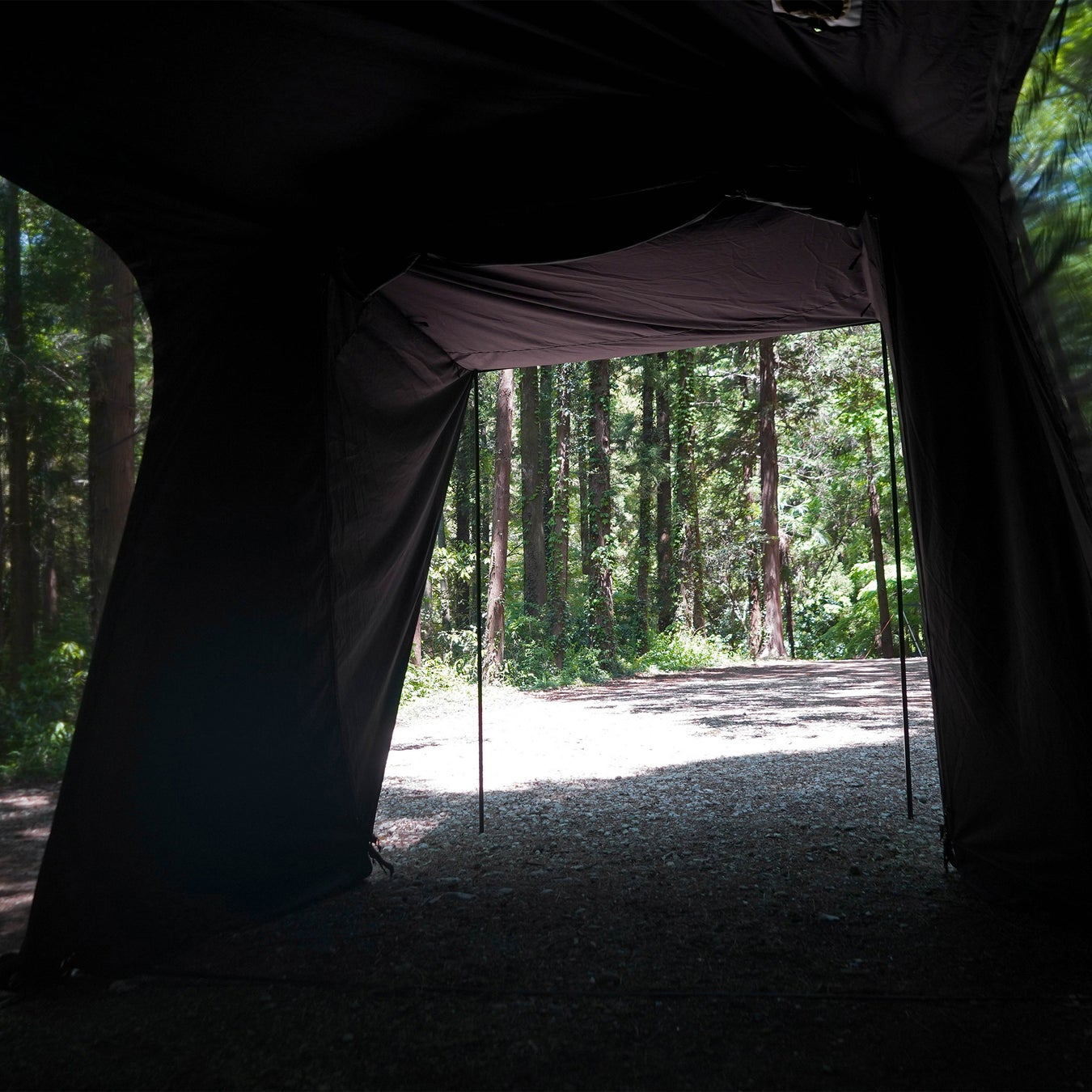 付属のサブポールを使うことでキャノピーを跳ね上げて、広々としたプライベート感のある前室スペースを作ることができます。