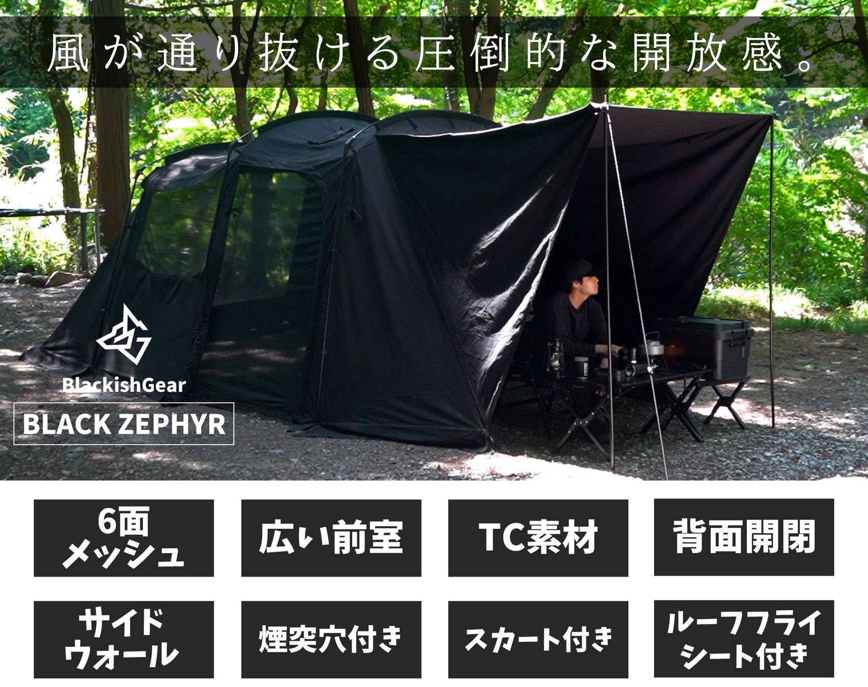ブラックテントでも珍しいTC素材を採用したBLACK ZEPHYR(ブラックゼファー)は6面メッシュ窓にできる2ルームテントです。