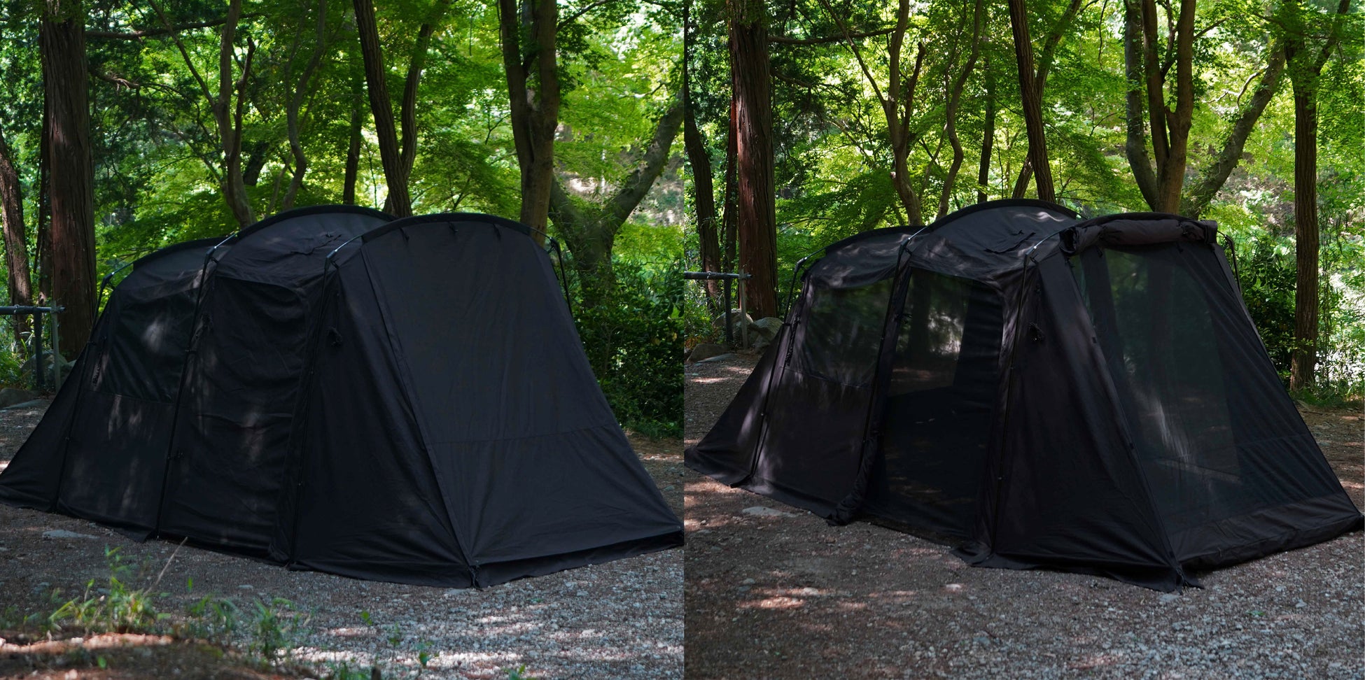 BLACK ZEPHYR(ブラックゼファー)は6面をメッシュ窓にできるトンネル型の2ルームテント。