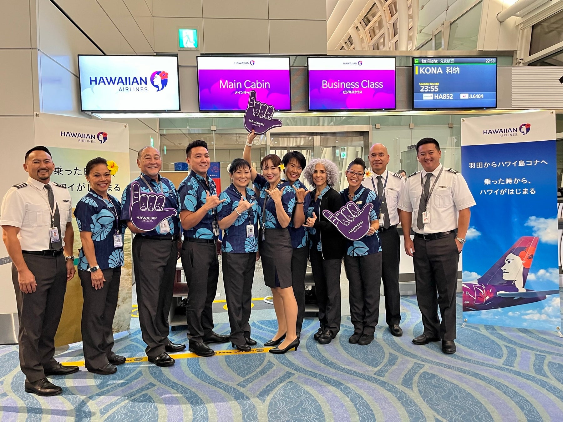 ハワイ・コナ発の初便も、現地時間10月29日出発し、30日の夜に羽田に到着しました。この便にはミッチ・ロスハワイ郡長が率いるハワイアン航空ハワイ島コナ代表団14名が来日しました。来日中は、観光関連団体への表敬訪問や姉妹都市との交流会をはじめ、日本国内に向けてハワイ島の魅力をアピールします。