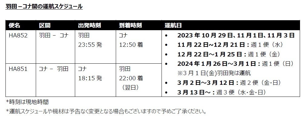 羽田―コナ線は、2024年3月にかけて段階的に従来の週3便の運航に戻していく予定です。