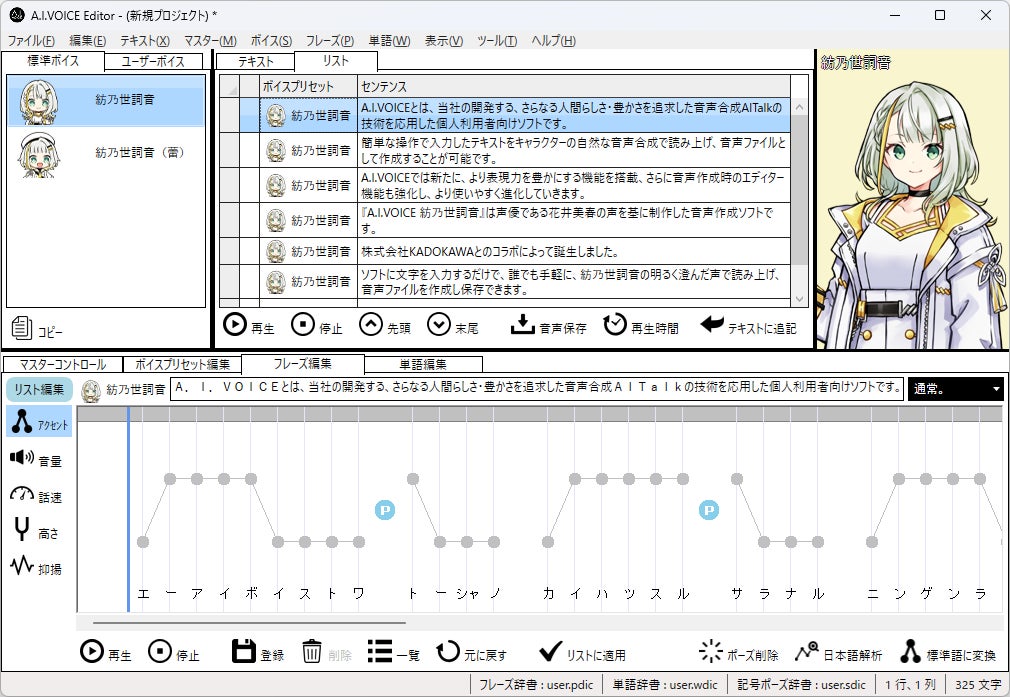 ソフトに文字を入力するだけで、誰でも手軽に、紡乃世詞音の明るく澄んだ声で読み上げ、音声ファイルを作成し保存できます。