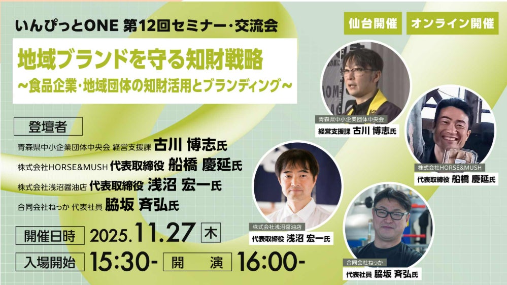 「いんぴっとONE 第12回セミナー・交流会 地域ブランドを守る知財戦略~食品企業・地域団体の知財活用とブランディング~ 」をハイブリッド方式(仙台)にて開催します。