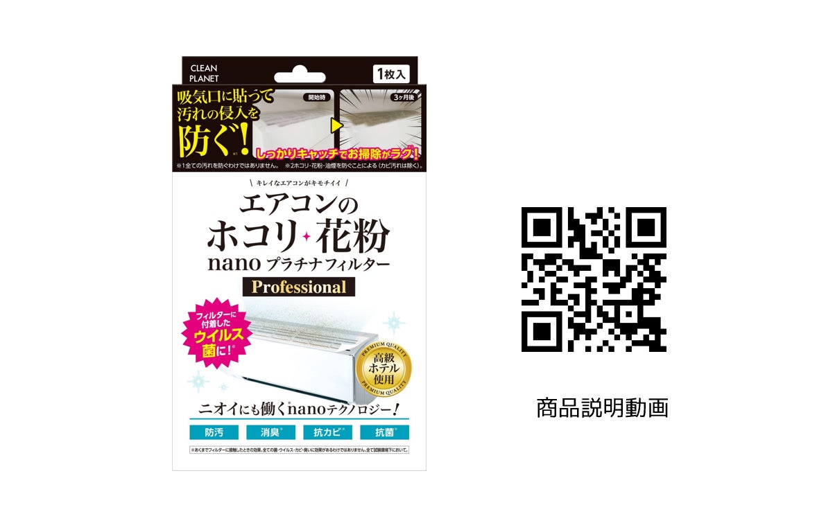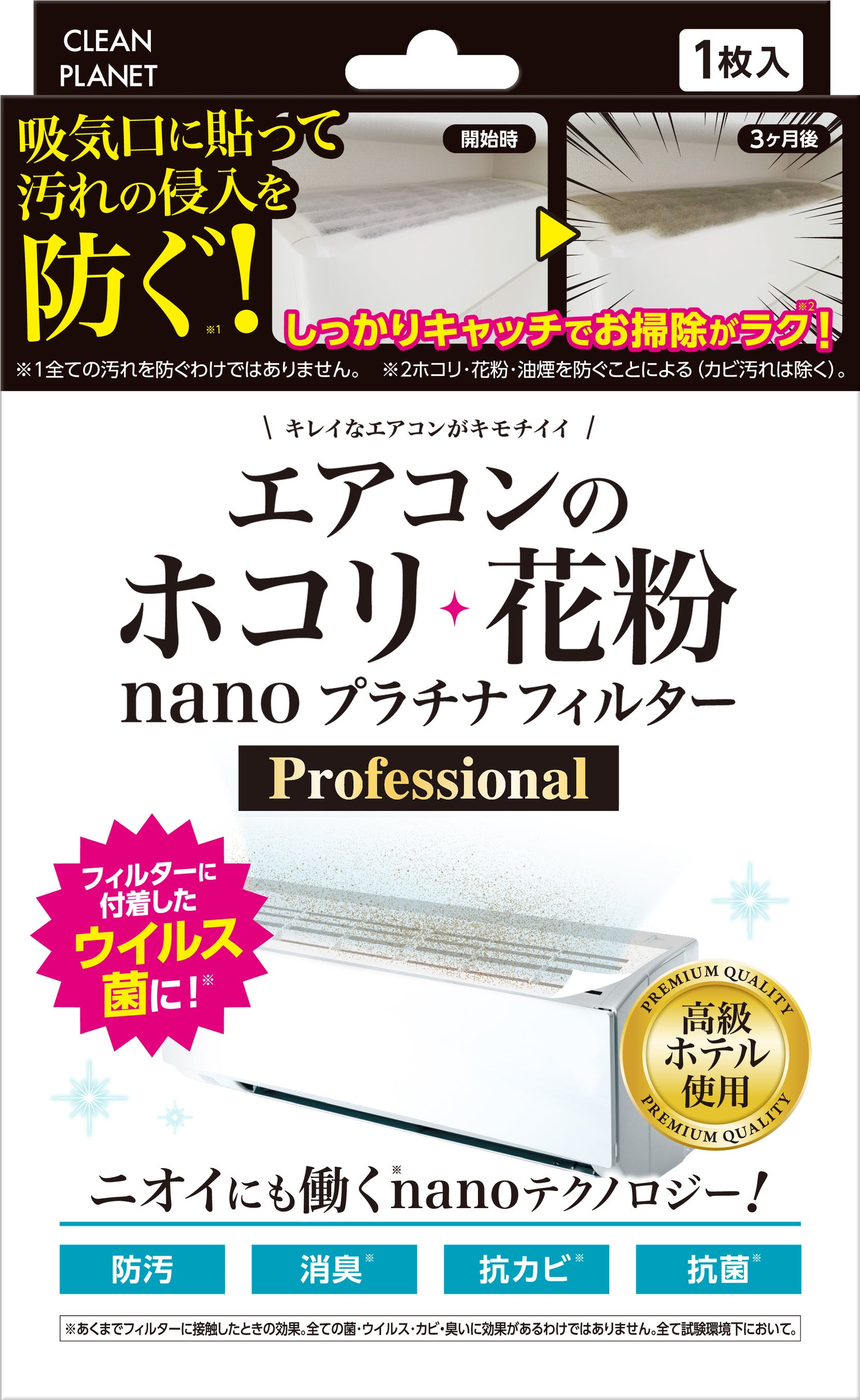 今回登場する「エアコンのホコリ・花粉 nanoプラチナフィルター」は、独自のフィルター加工技術によってコーティングされた3種のnano粒子素材がフィルターに付着した菌・ウイルス・臭い*3に働くフィルターです。高級ホテルでも使用されており、お部屋のホコリや花粉、油煙などをしっかりと吸着*2することでエアコン内部の汚れがつきにくくなり、冷暖房効率の維持に繋がります。
