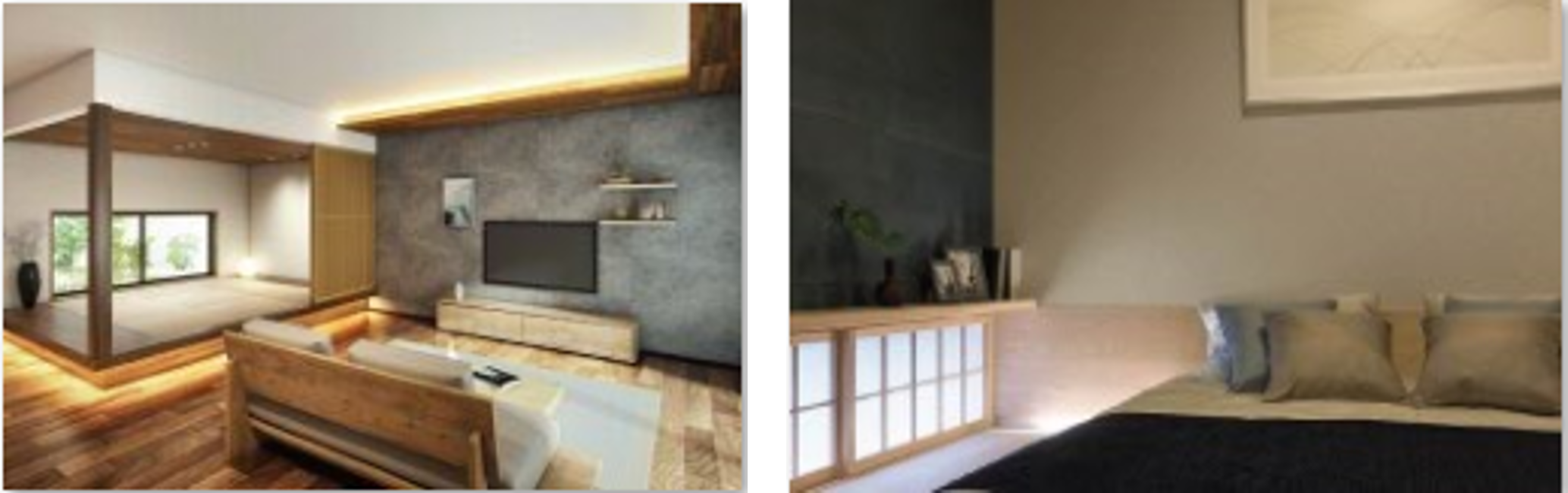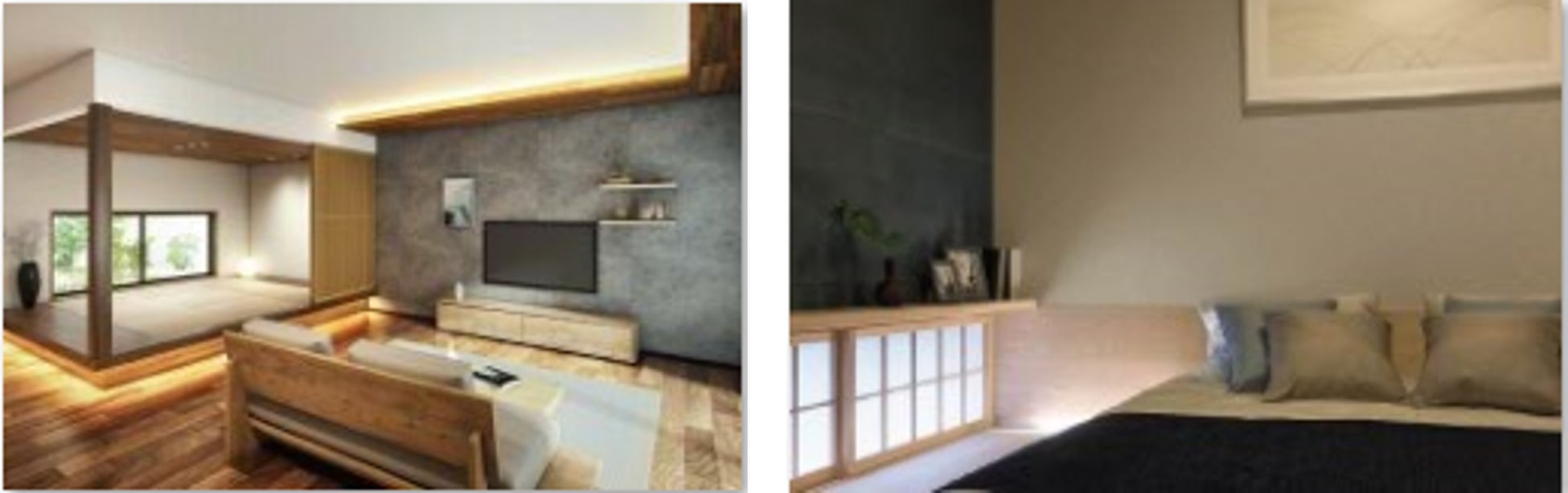 伝統と現代が美しく融合したインテリアスタイル。建具や格子などの直線的な要素と、間接照明や障子から射し込む淡い光の要素を合わせることで、スタイリッシュで上質な大人の空間を実現します。