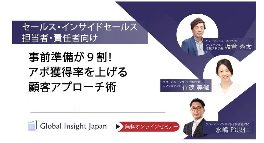キューアンドエー株式会社(東京本社:東京都渋谷区、以下「当社」)とグローバルインサイト合同会社は、「セールス・インサイドセールス担当者・責任者向け 事前準備は9割!アポ獲得率を上げる顧客アプローチ術」をテーマに2023年12月5日(火)に共同ウェビナーを開催しました。今回ご好評につき、本日3月27日から4月5日まで、限定でアーカイブ配信をいたします。