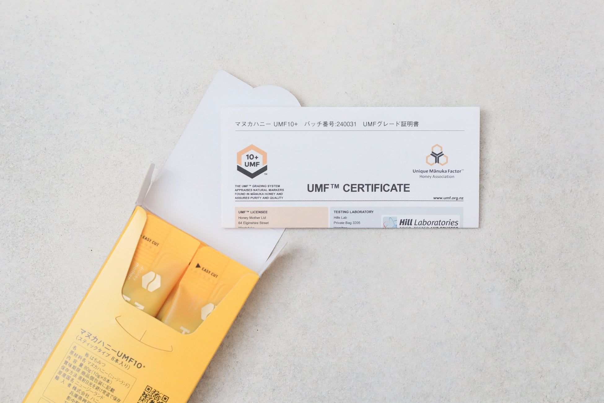 ハニーマザーのマヌカハニーはトレーサビリティも万全。パッケージ裏面には「バッチ番号(品質証明番号)」が記載され、そのロットに付随するUMFグレード証明書や残留農薬不検出証明書も同梱されています。