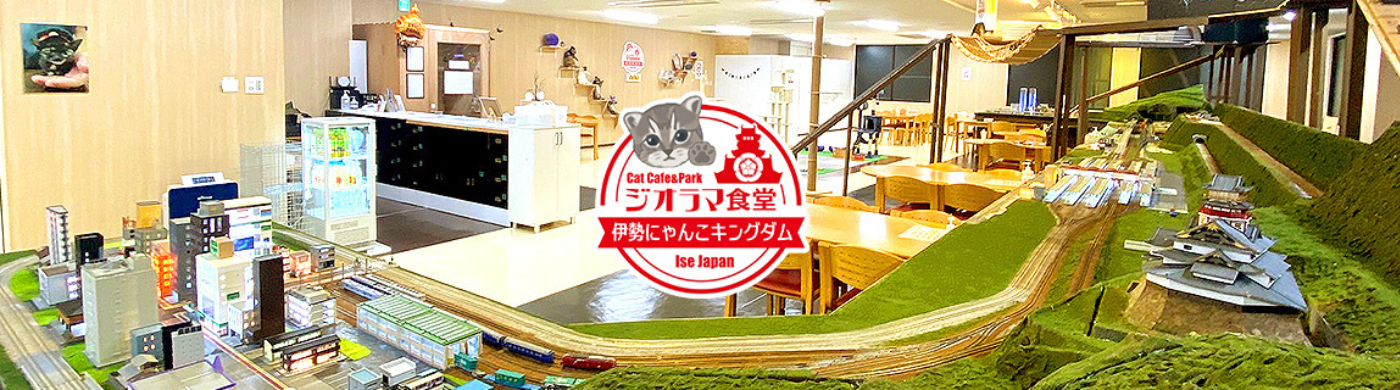 伊勢忍者キンクダム内にある、保護猫とジオラマを一緒に楽しめる猫カフェです。