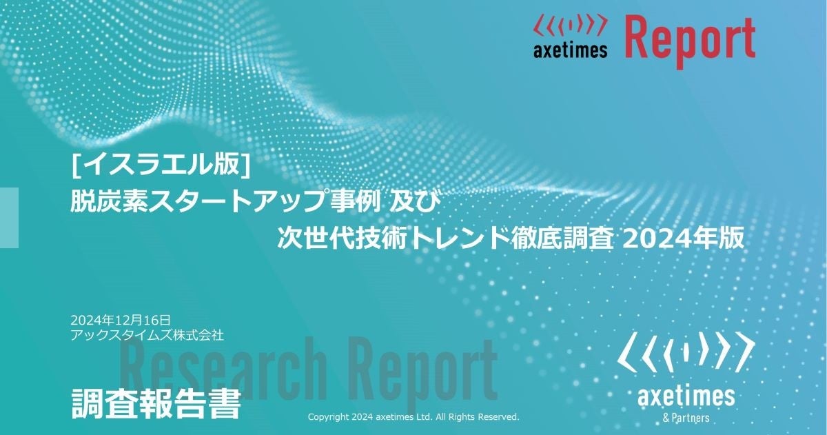 ビジネス解像度を高めるリサーチ情報サービスを展開するアックスタイムズ株式会社(所在地:大阪府大阪市中央区、代表取締役:橋本規宏)は、グローバルの脱炭素スタートアップの技術トレンドから次世代ビジネスを展望する調査報告書シリーズの第四弾(※)として「[イスラエル版] 脱炭素スタートアップ事例 及び 次世代技術トレンド徹底調査 2024年版」を、2024年12月16日にリリースしたことをお知らせします。
