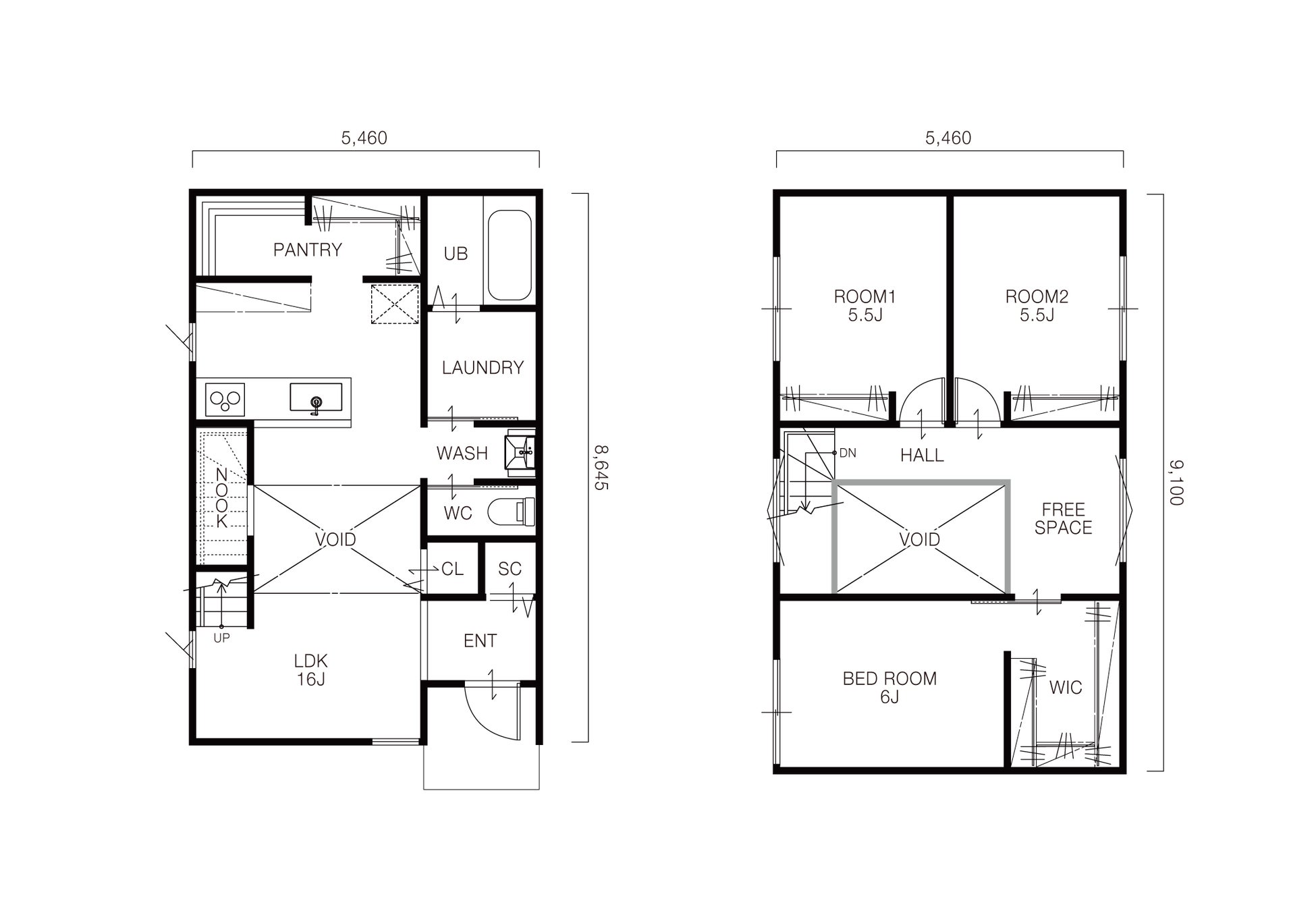 吹き抜けでつながる2階フロアには、大容量のWICを備えた寝室と5.5帖の洋室2部屋を完備。 家族構成の変化やライフスタイルに合わせて柔軟に対応可能な設計です。