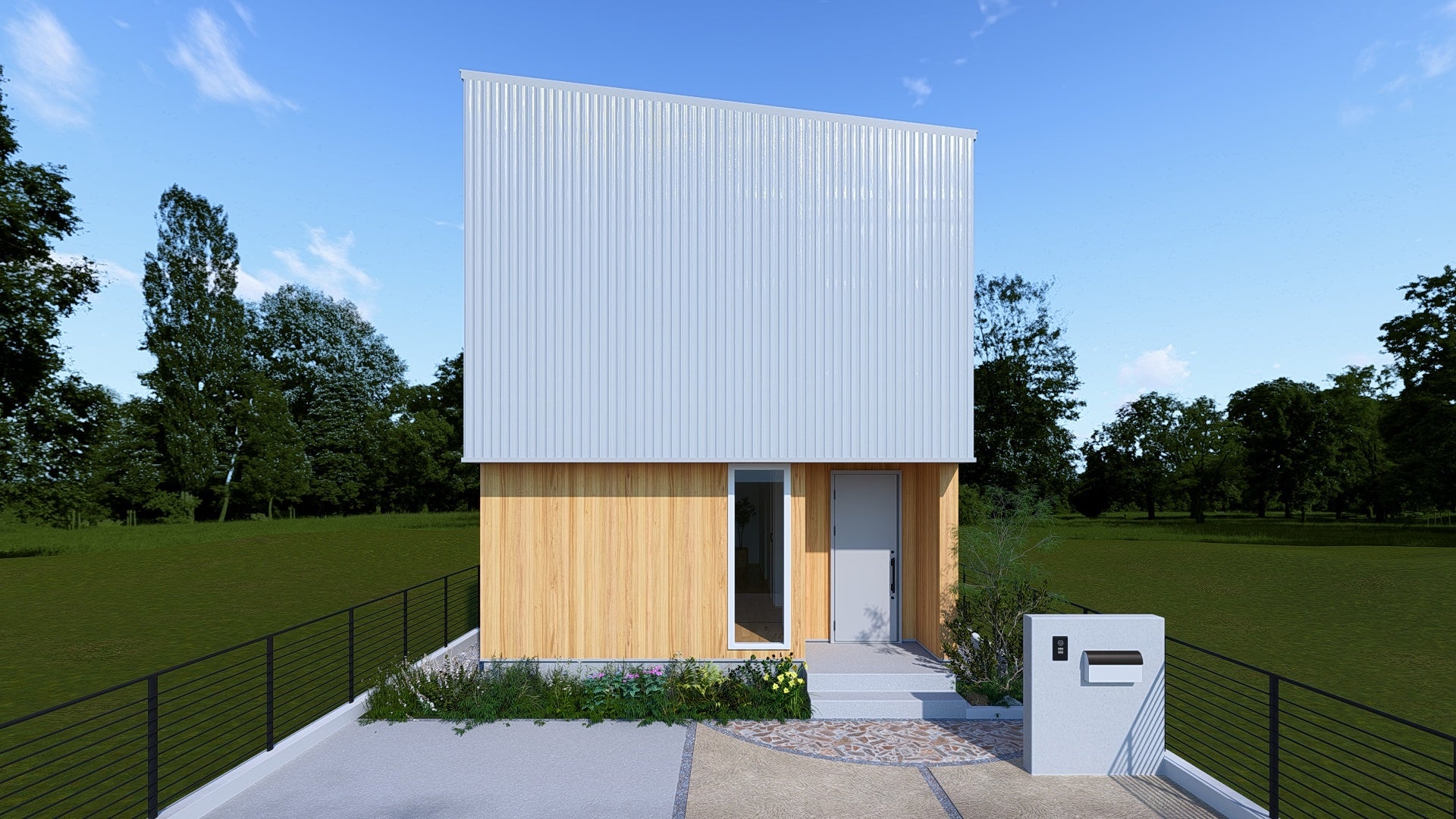 白のガルバリウムと天然木が調和する、シンプルナチュラルな外観。