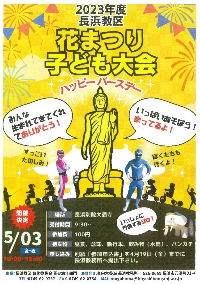 大谷大学(所在:京都市北区 学長:一楽 真)では、2024年5月3日(祝・金)に真宗大谷派長浜別院大通寺を会場に開催される「2023年度長浜教区花まつり子ども大会」に、大谷大学同窓会長浜支部からの要請により、イベントを盛り上げるために学生サークルの派遣と大谷大学情報コーナーの開設協力を行います。