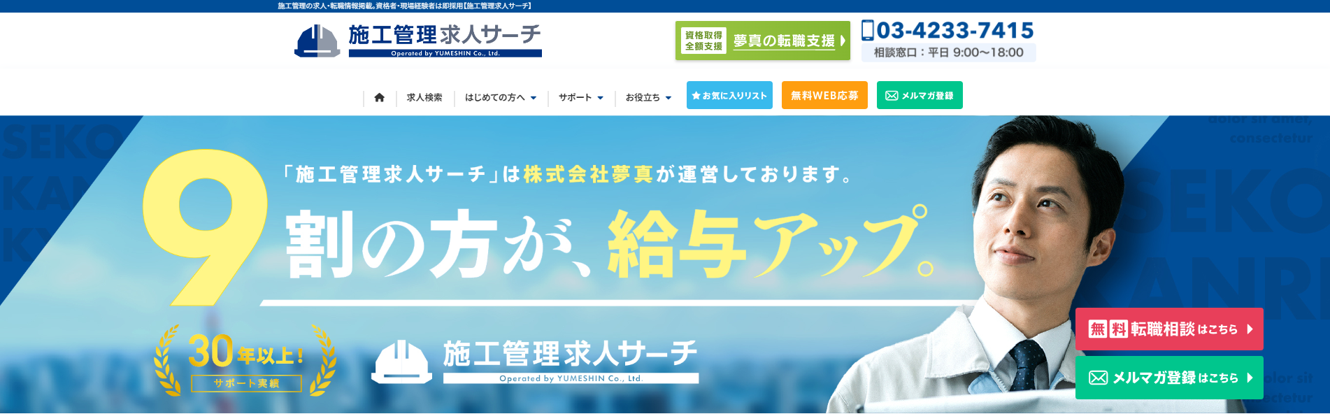 施工管理求人サーチは、株式会社夢真が運営する「エンジニアファースト」を掲げる求人・転職サイトです。派遣の形式で、スキルや経験を有した経験者の方に、全国に9,000件以上の求人の中から最適な案件をご紹介。建設派遣事業30年以上のノウハウをもとに、専門チームが就職・転職を徹底サポートいたします。