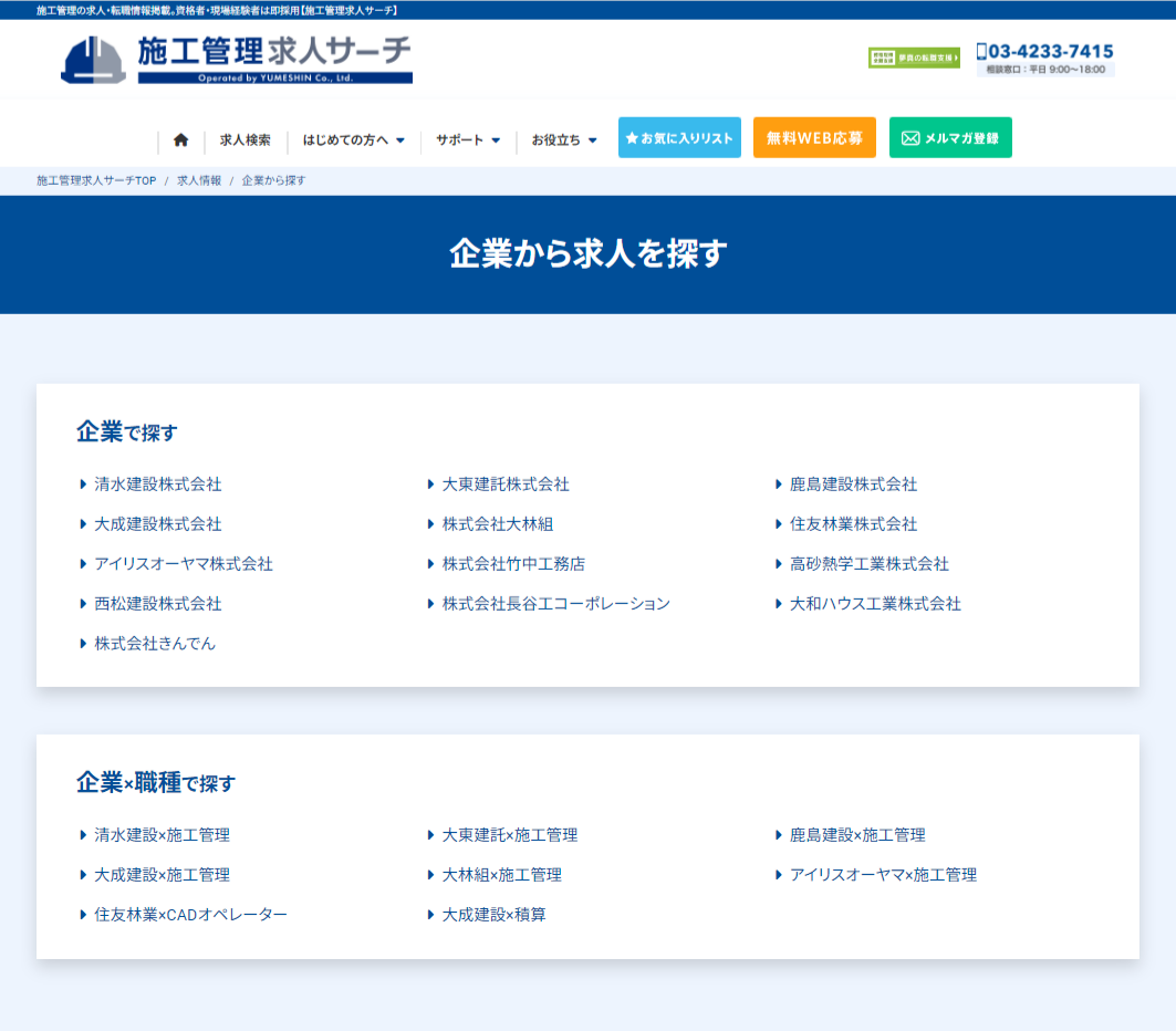 俺の夢から施工管理求人サーチへのリニューアルに伴う最も大きな変化点は、求人を企業名から探せるようになったことです。取引先顧客社数1,623社(2023年6月末時点)の中から、主要な企業や「企業×職種」の組み合わせで求人を絞り込んで検索できる機能を追加しました。