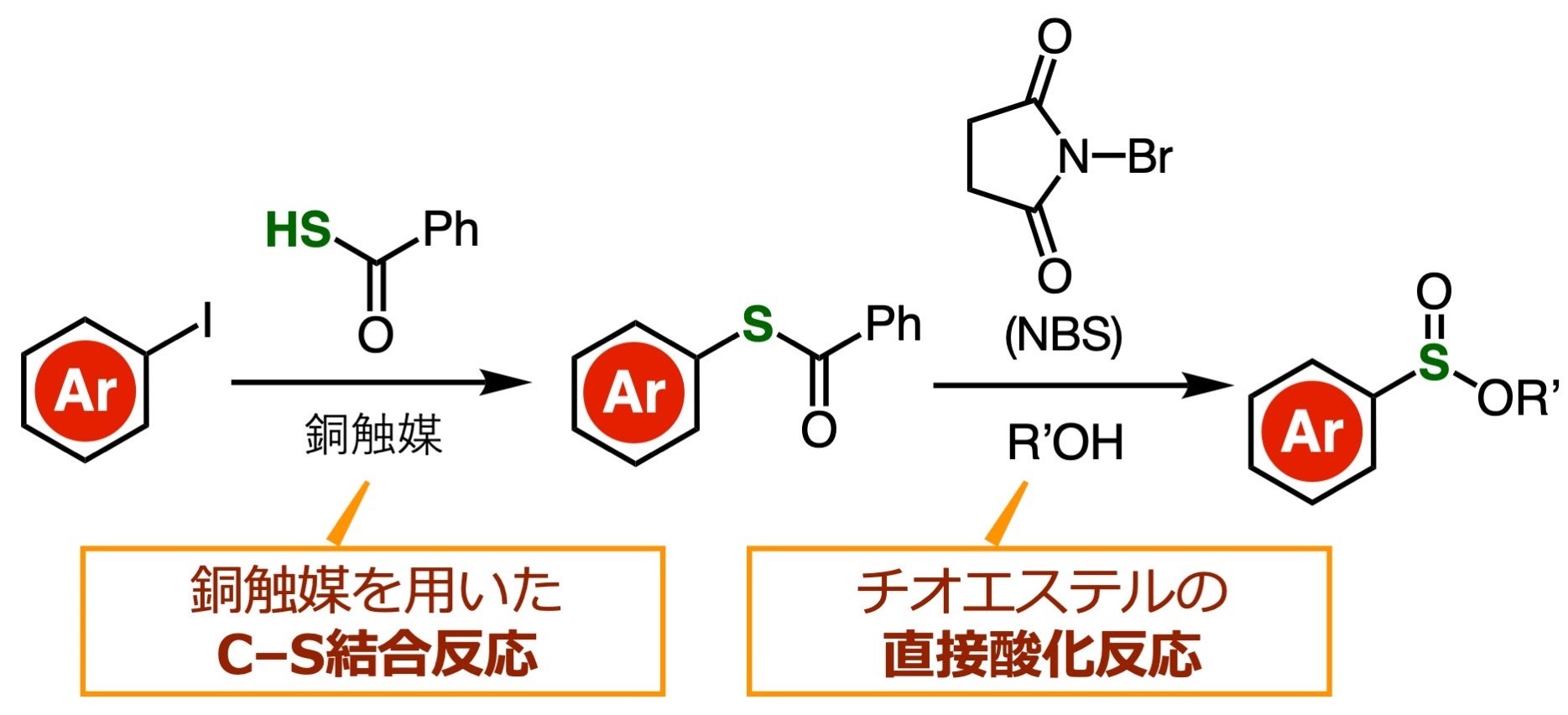 本研究での検討の結果、ヨウ化アリールを出発原料としてわずか2つの工程で目的のスルフィン酸エステルを合成することに成功しました。第1の工程では、ヨウ化銅(I)CuI触媒を用いたC−S結合形成反応によって、チオエステル化合物を合成します。第2の工程では、得られたチオエステル化合物をN-ブロモスクシンイミド(NBS)などの反応剤を利用して直接酸化し、目的のスルフィン酸エステルを合成します。