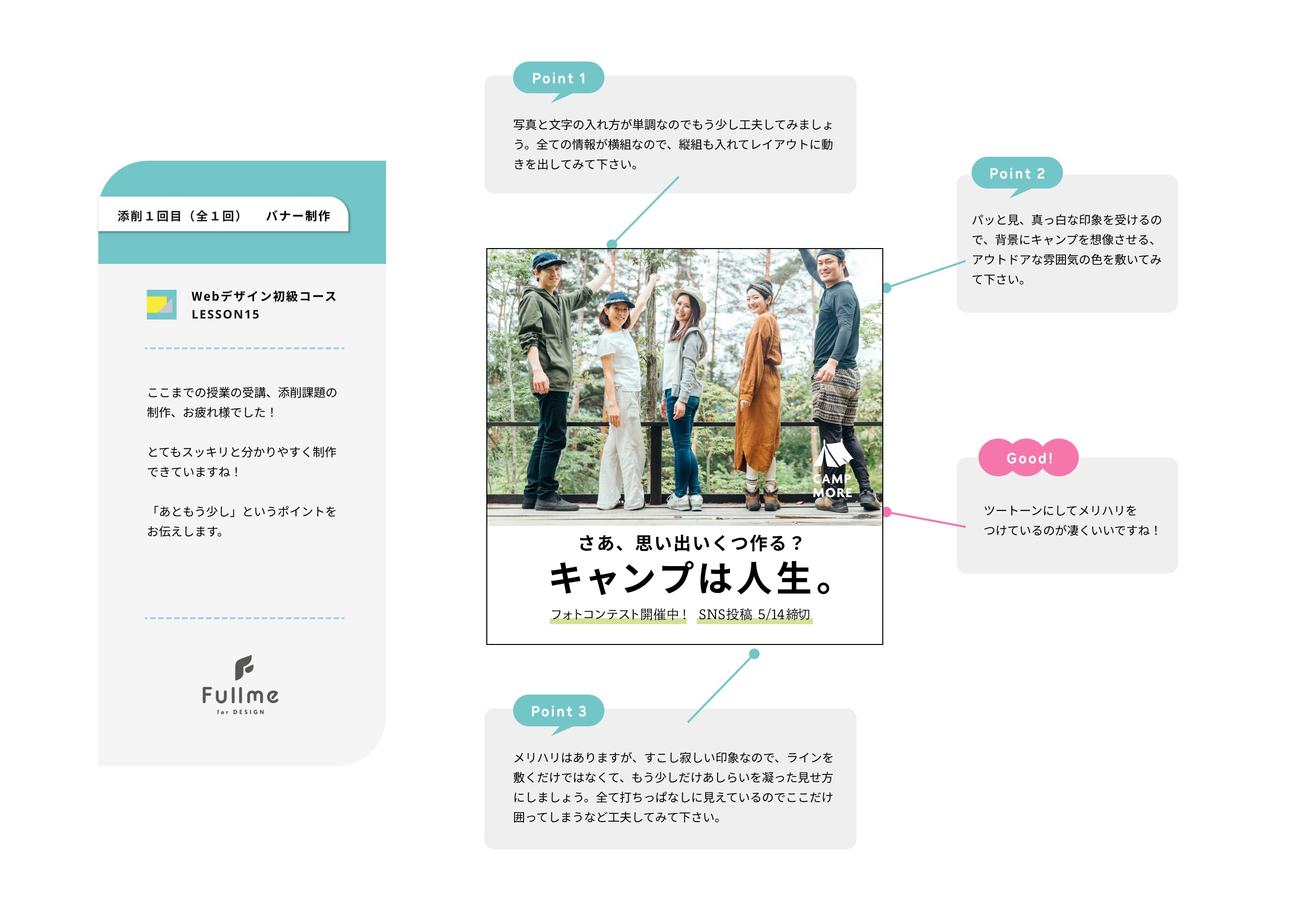 Fullmeはデザインの学びを通して「人生の充実」をコンセプトにしたオンラインデザインスクールです。デザインの表現力を高めることで、仕事や社会で「求められる人」として活躍するきっかけを作ります。ビデオオンデマンド型で「いつでも」「どこでも」「楽しく」本気のデザイン学習に取り組むことができるのが特徴です。また、授業の制作や添削課題はデザイン解説のプロであるingectar-eのデザイナーが務めます。