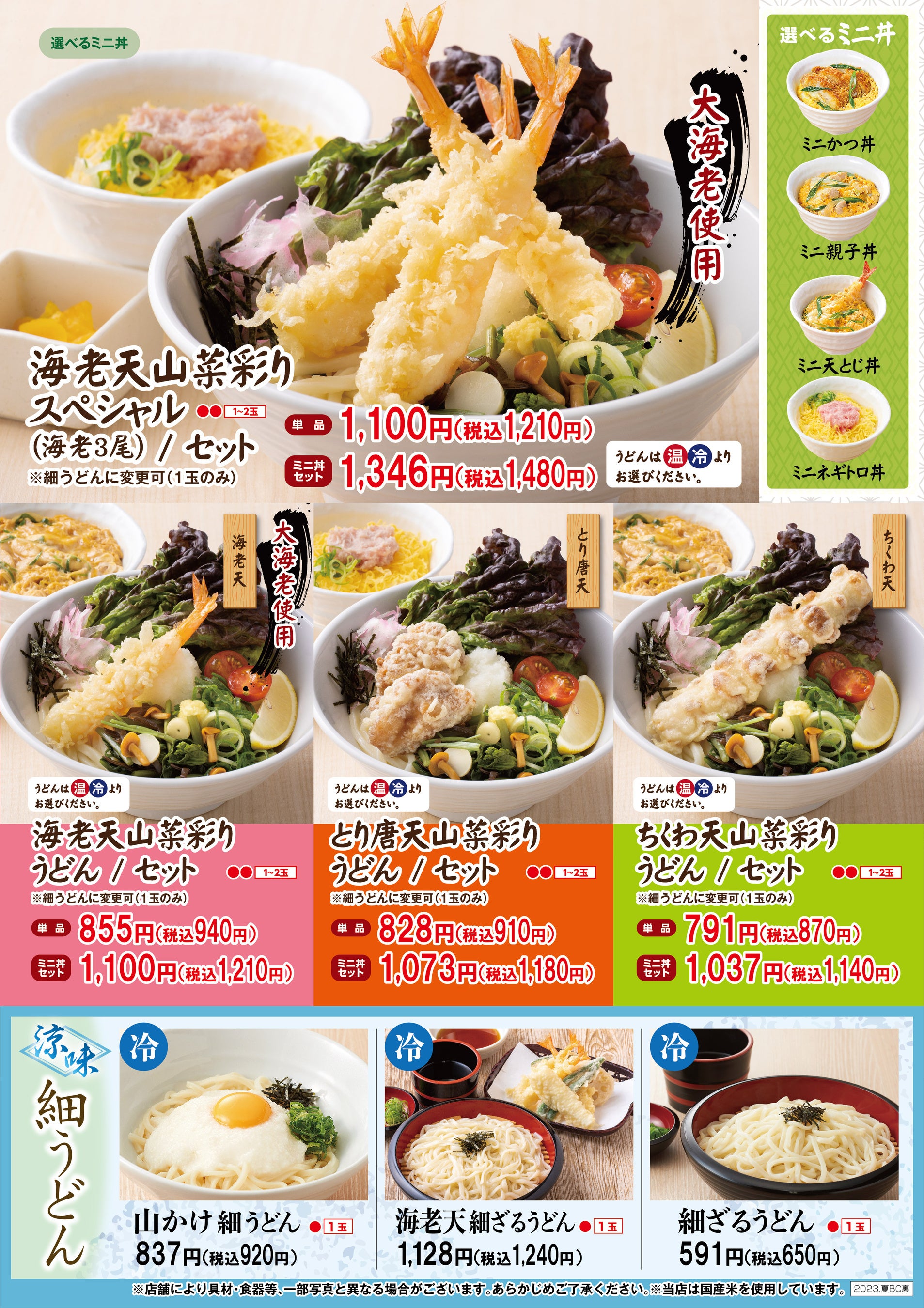 また、得得うどんの夏の定番「山菜彩りぶっかけうどん」に海老天・とり唐天・ちくわ天をそれぞれトッピングしたメニューや、海老天3本をトッピングした「海老天山菜彩りスペシャル」をご用意しております。