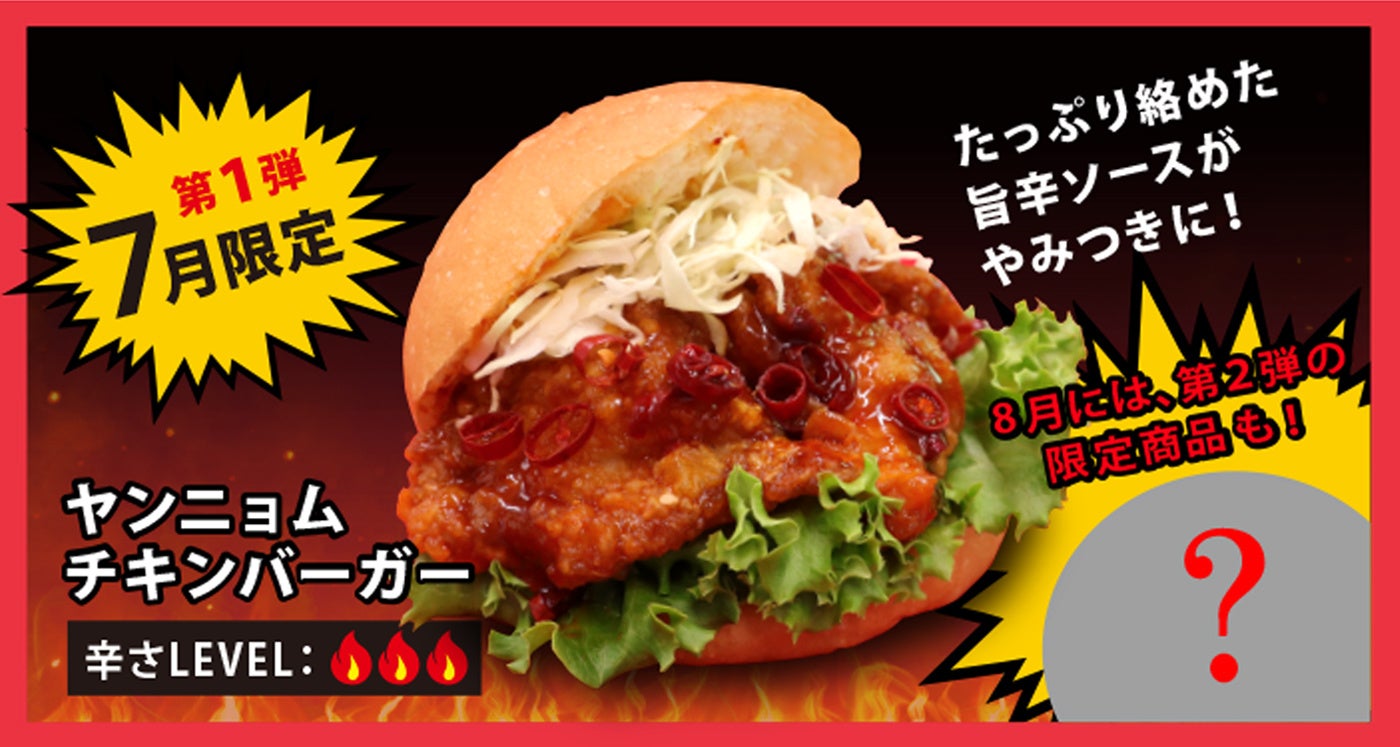 7月3日から始まる【第1弾】では、スパイシーなメニュー3アイテムの他、7月限定商品『ヤンニョムチキンバーガー』を。さらに、8月1日からの【第2弾】でも、限定商品が登場しますのでご期待ください!