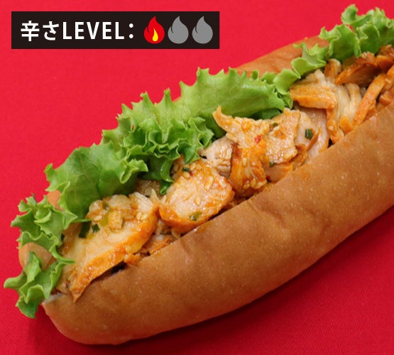 商品特徴:旨辛いヤンニョムソースを、しっとりやわらかいタンドリーチキンにあえ、リーフレタスと一緒に挟みました。赤唐辛子もたっぷり添えた、旨辛さが病みつきになる一品です。