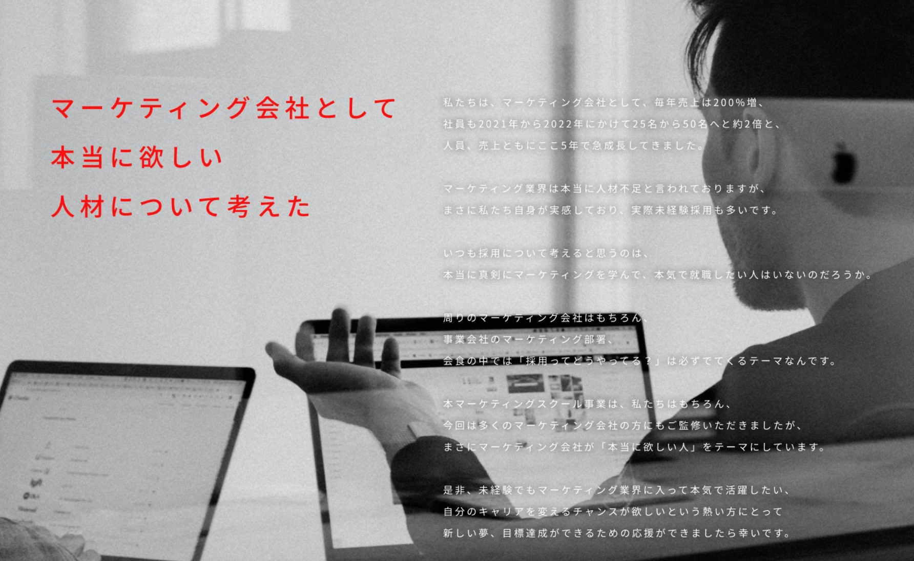 〜マーケティング会社や経営層が求める”本当に欲しいマーケター”を分析し尽くした独自の教育カリキュラムを実現、未経験の方でも実践力が身に付く〜
