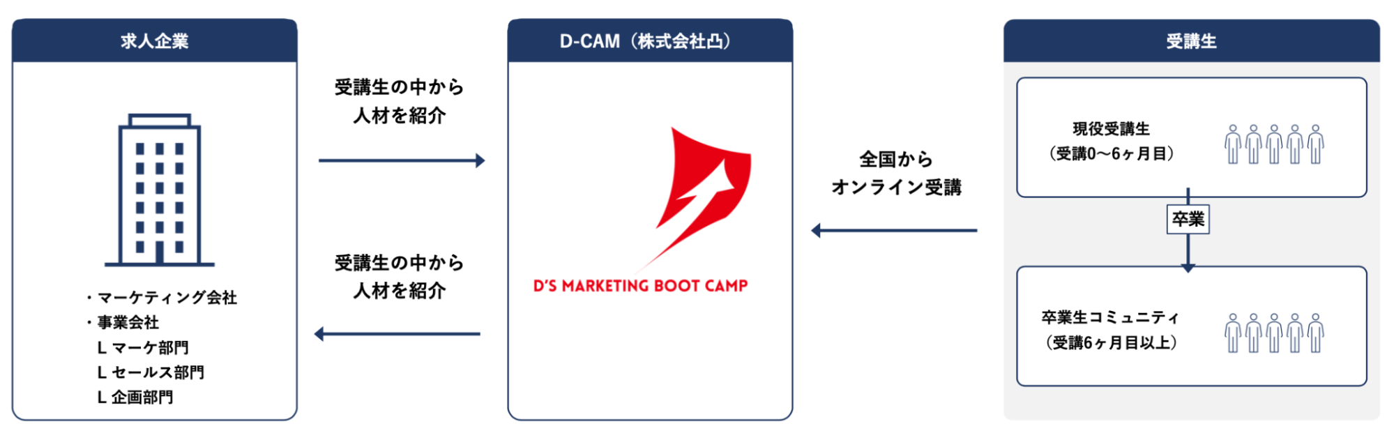 凸はマーケティング会社として、経験豊富なマーケターの採用に課題を抱えていました。さらに、未経験者を採用しても、その育成にはリソースが不足している企業が多いという現状があります。この市場のニーズに応えるため、「D-Cam」は誕生しました。