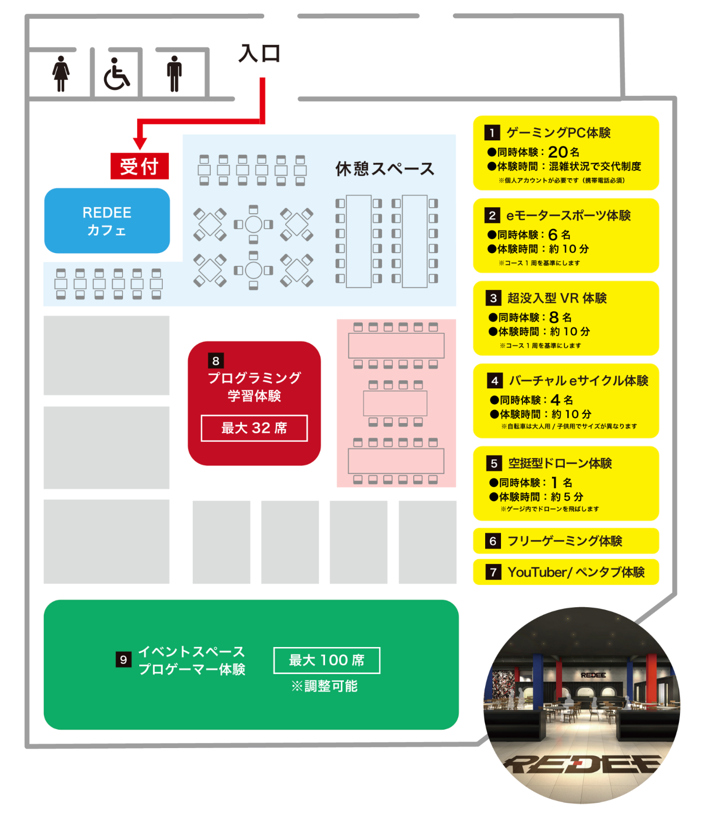 REDEEはデジタル複合施設のパイオニアです。最先端技術やビデオゲーム(eスポーツ)などを通じて、デジタル技術をはじめとした広域な知識・スキルを学ぶための施設です。"エデュテインメント(エデュケーション×エンターテインメント)"をコンセプトに掲げるREDEEは、学びと遊び=楽しみながら学ぶ場所です。学校でも塾でもない場所で、自分のやりたいことを見つける「サードプレイス」として、あらゆる人に学びの機会を創出します。学校団体向けの体験学習施設、福祉団体向けの就労体験施設など、学びの施設として多くの役割を果たします。また、200名以上収容可能なスタジアムやカフェテリアを活用した多種多様なイベントを開催することで、地域社会の活性化を目指します。
