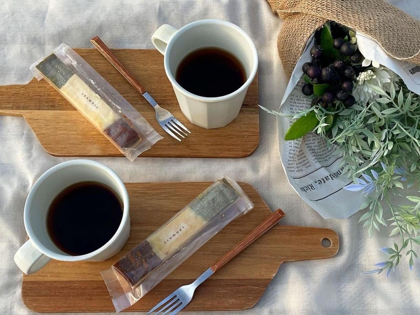 今回販売するピクニックバスケットには、店内で毎日焼き上げる看板メニュー「グリーンティーマーブルチーズケーキ」をセットにしております。北海道産チーズをたっぷりと使用し、濃厚でしっかりとした味わいが特徴です。抹茶(緑)、カカオ(茶色)、プレーン(白)の3種類が織りなすマーブル模様は、味の変化を楽しめる一品となっていて、開業当初より人気の商品です。