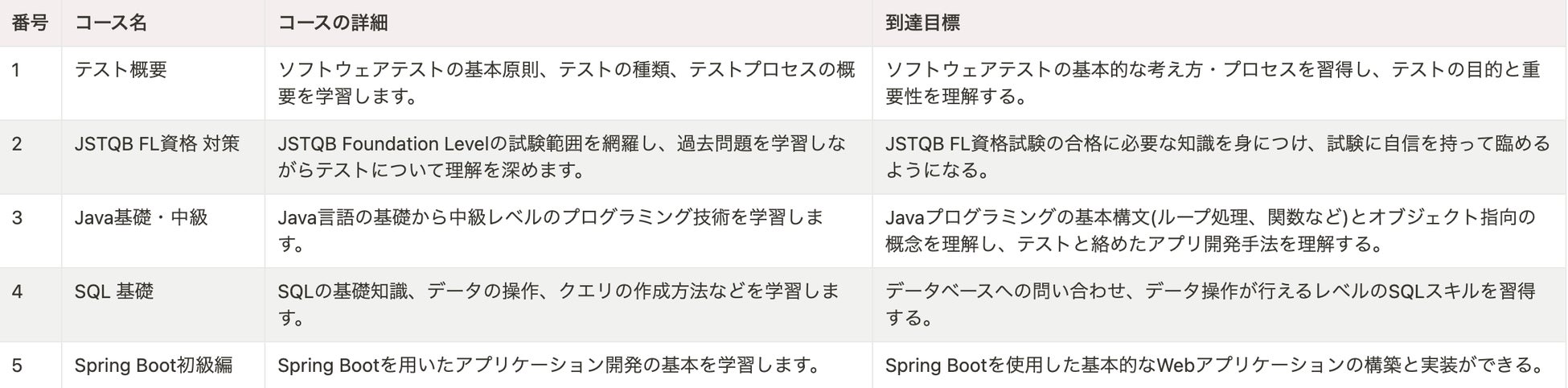 このコースを通じて、研修生はIT業界で求められる高いテスト技術と実践スキルを習得し、テストエンジニアとして勤務できるレベルになることを想定します。