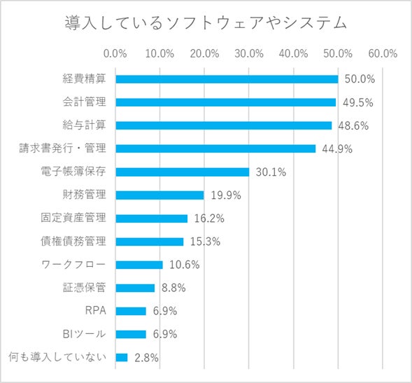 「経費精算」「会計管理」「給与計算」に関しては、約半数の企業が導入している状況で、次いで、「請求書発行・管理」に関するソフトウェアやシステムも導入率が高い結果となりました。