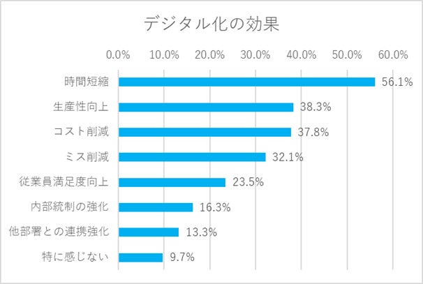 「時間短縮」が56.1%と圧倒的に多い結果となりました。次いで、「生産性向上」が38.7%、「コスト削減」が37.8%と続いています。計算の自動化などによる時間短縮は、実務担当者としては、いち早く感じられる効果で、それによる生産性向上などの実現につながっていると考えられます。