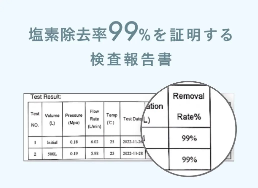 一般的に塩素除去フィルターには亜硫酸カルシウムが使用されることが多いですが、Noendは素材までこだわり自然素材の活性炭を採用しています。活性炭は亜硫酸カルシウムフィルターと比較し、10倍の耐久力と3倍の塩素除去率*を発揮。