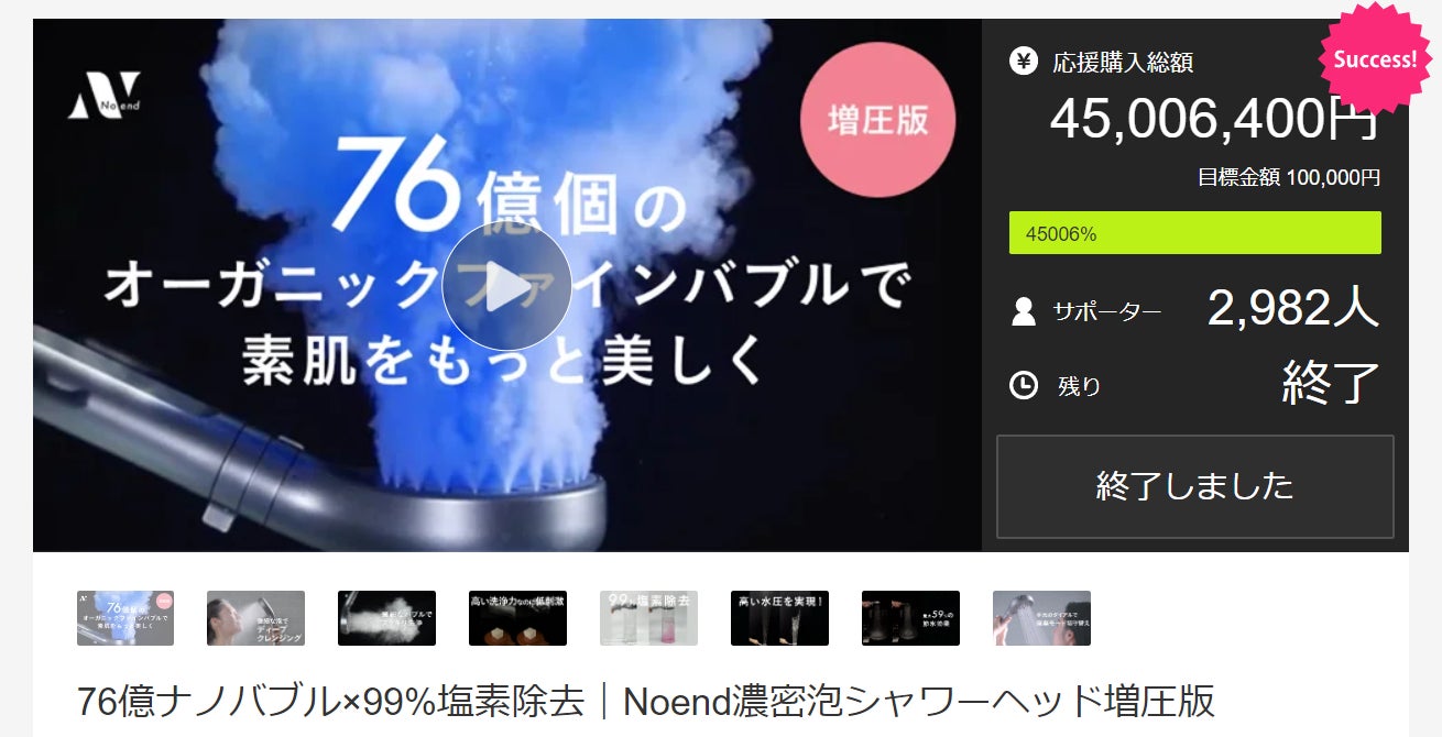 「Noend オーガニックファインバブルシャワーヘッド」の増圧バージョンは、2024年5月に応援購入サービスMakuakeにて先行販売を実施。約1ヶ月半のプロジェクト期間で応援購入総額4,500万円を達成し、Makuakeデイリーランキング1位を獲得*した製品になります。