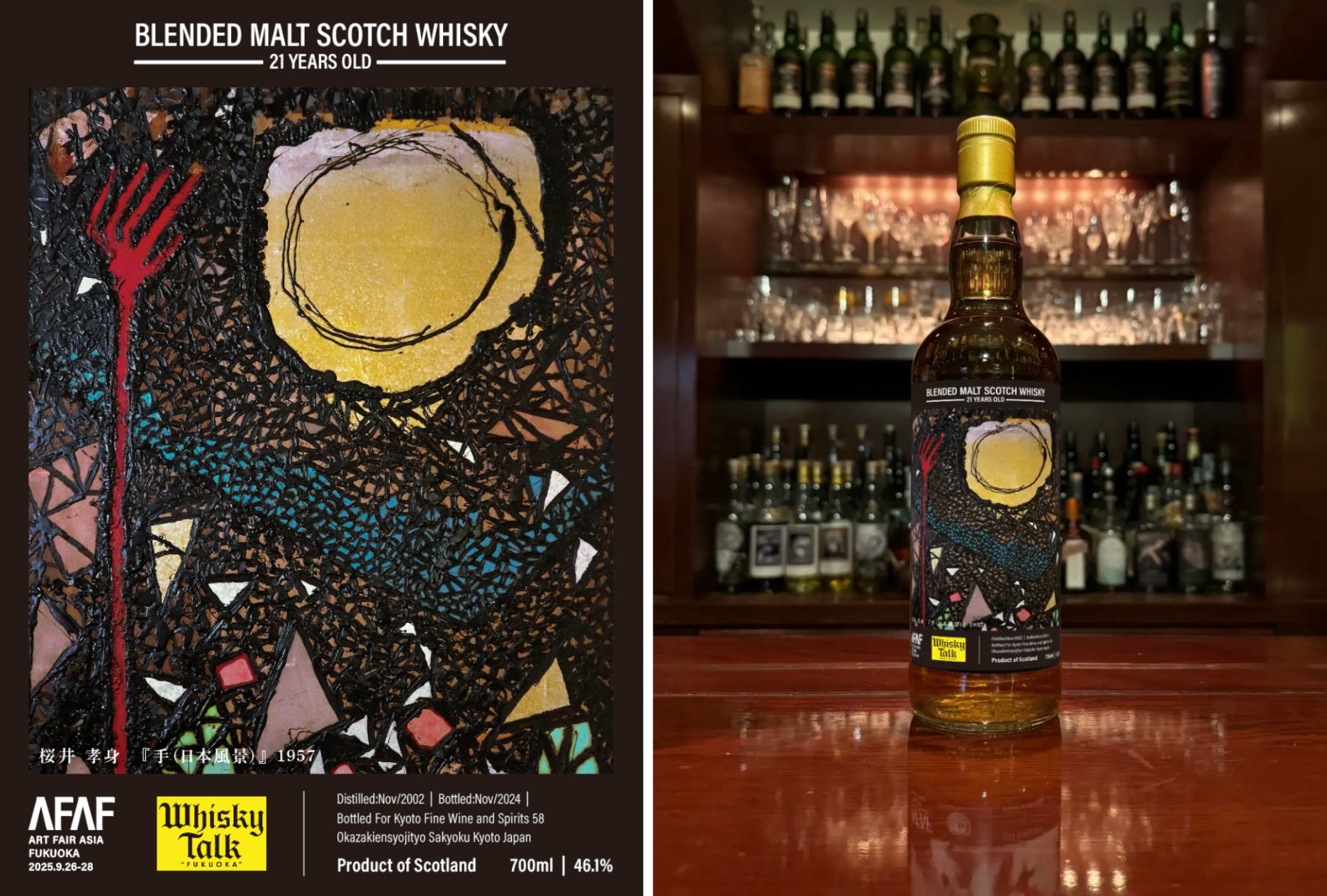 第2弾となる今年は、戦後美術の重要な潮流「九州派」の主要メンバーであり、独自の絵画表現で知られる桜井孝身の作品「手(日本風景)」(1957)を採用。ボトリングされたのは、2002年蒸留・21年熟成のブレンデッドモルト〈スコッチウイスキー〉(#47、アルコール度数46.1%)。