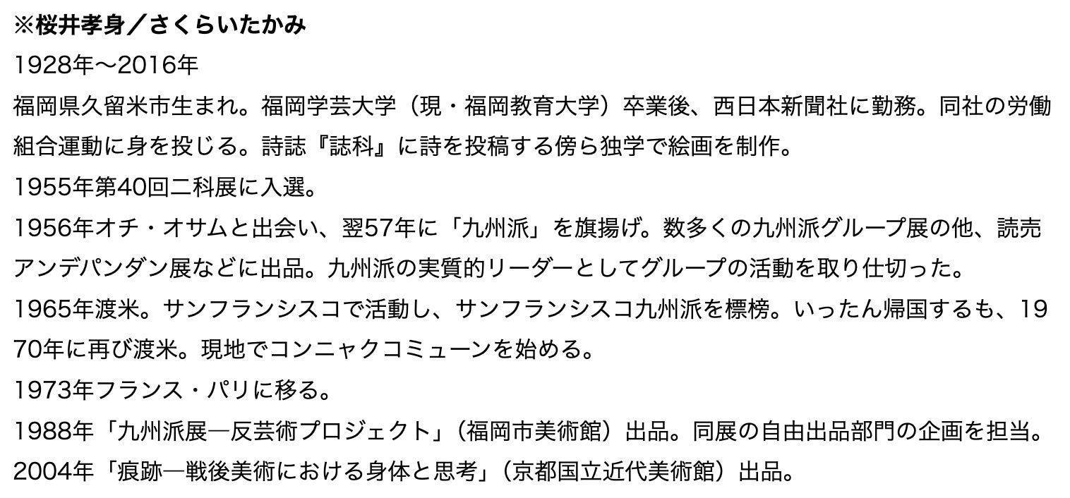 「『九州派』が注目を集めている、としばしば耳にする。おそらく、『戦後』が遠ざかった今、若い世代の中に、その時代のエネルギッシュな動向が新しい眼差しが注がれているのではないか、と予想する。この数年で田部光子、オチ・オサム、尾花成春といった九州派に所属した作家の回顧展が立て続けに美術館レベルで開催され、九州派研究も新たな段階に入った。専門的な美術教育も受けず、たいしたアートシーンも周囲になかった福岡で、なぜ彼らは死ぬまで作品を作り続けられたのか。その創作の持続の原動力、あるいはスプリングボードとして『九州派』が機能したことは間違いない。この展覧会では、『九州派以後』作品をあえて取り上げ、それぞれの創作の『持続力』に注目する。彼らはいかに『命のアーチをかける』ことができたのか。作家は常に、それを死後に問われることになる。その輝きは、『九州派』を逆照射するだろう。」