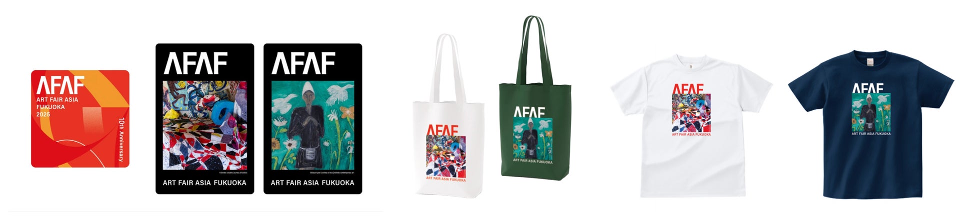 ブスイ・アジョウの鮮烈な色彩の表現や、牛島智子の独自の視点から生み出されるモチーフをデザインに落とし込み、Tシャツ、トートバッグ、ステッカーとして展開。会場およびAFAF公式グッズサイトにて販売予定です。今年の「Feature」を象徴するデザインは、ご来場の記念やお土産にもおすすめです。