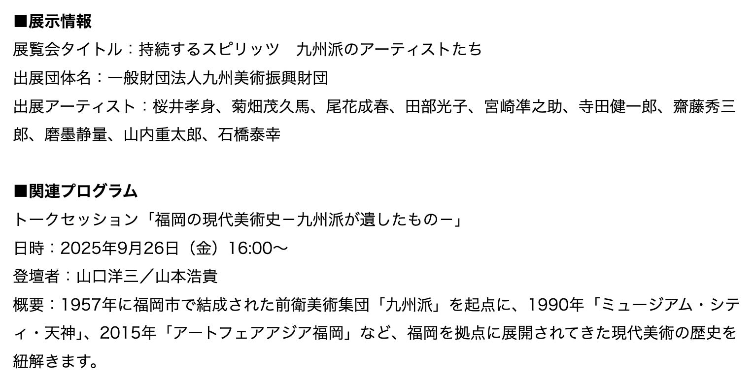 「近年ますます注目度を高める戦後日本美術史における『九州派』の位置付けは、その大胆さやラディカルさに重きを置いたものとなっている。だが、同様に注目されるべき点は、そのグループにおいて驚くべき多様性が維持されていたことだと思う。今回の展示は、『運動』としての九州派を構成する個々の作家や作品に特に焦点を当てている。また、本展には各作家の九州派『以後』の作品も多く出展されている。それらの特徴は、この特異な前衛芸術家集団が、そこに関わった作家たちにどのようなものを『遺した』のかを示すことを可能にする。その遺されたレガシーは必ずしも目に見える形式上のものだけではないので、じっくりと作品を眺めて、そこに流れている時をこえて持続するスピリットのようなものを感じ取ってもらいたいと願う。」