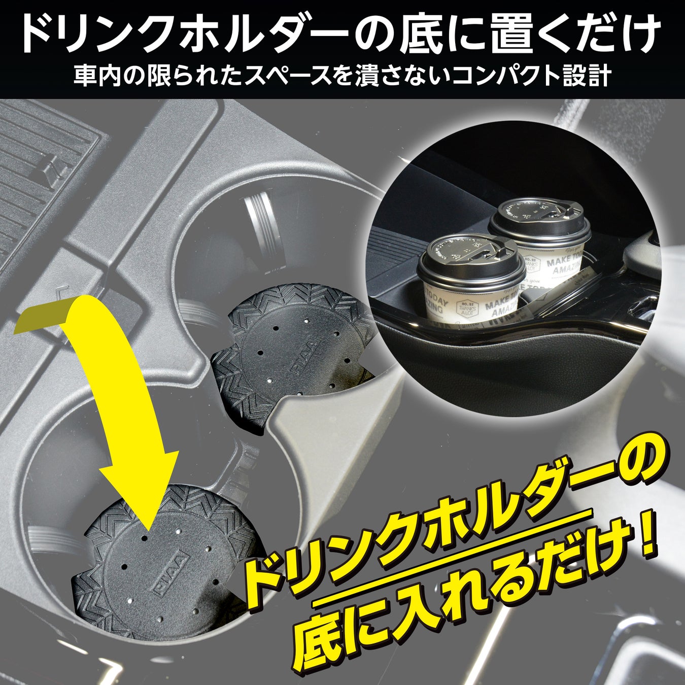 直径70mm、厚み約15mmの薄型なのでドリンクホルダーをつぶすことなく、飲み物を置くことが可能。
