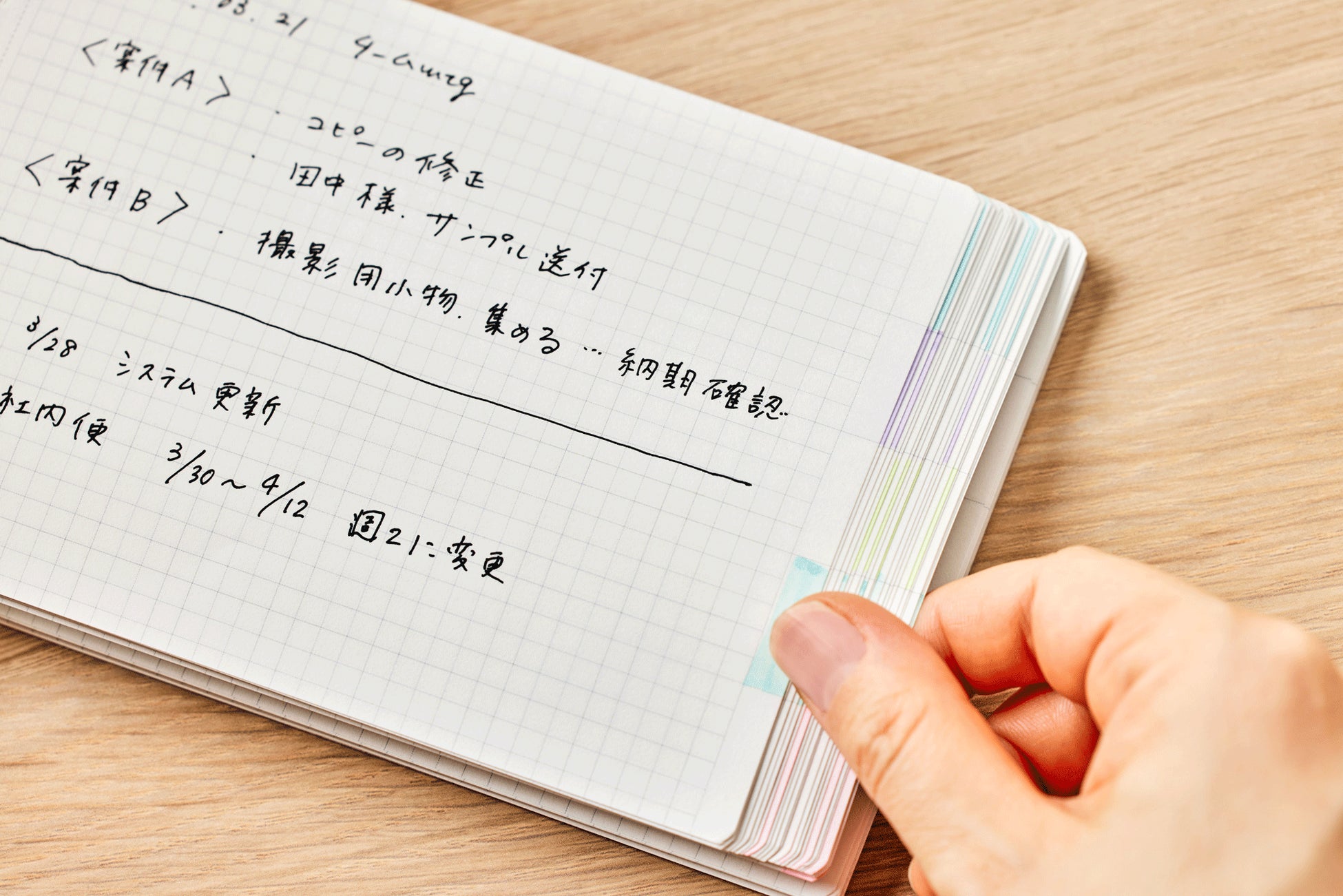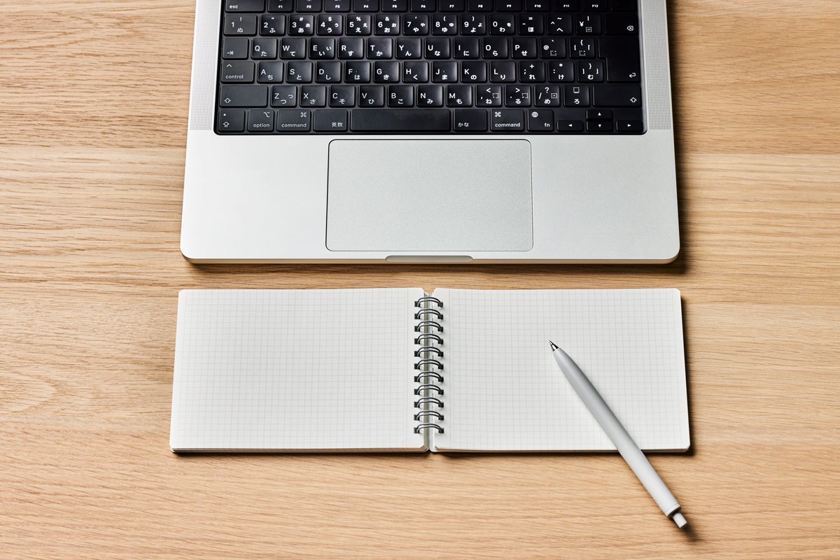 PCの手前に置いて情報をメモしたり、ノートで構成を練ってからデジタルにアウトプットするなど、デスクの上でデジタル機器と合わせて使いやすいサイズ展開です。